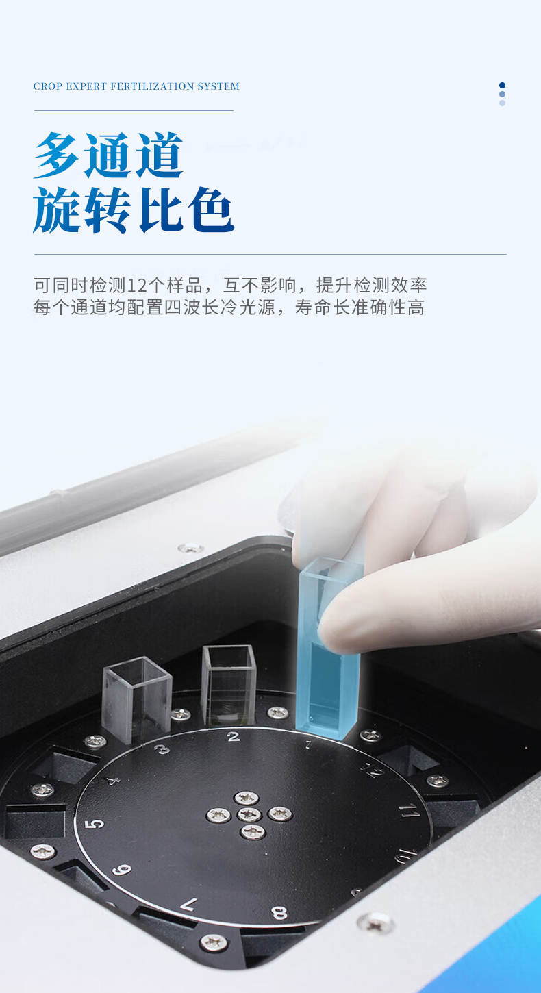4、采用精密旋轉(zhuǎn)比色池設計,光源一致性更加精確保證檢測精度。一次性可快速檢測12個樣品,極大提升檢測效率,降低檢測成本。