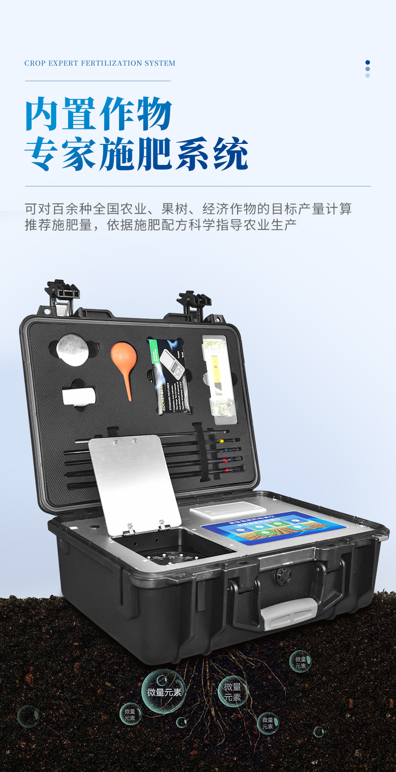 配套齊全,該儀器集藥、器、儀為一體,攜帶方便,相當于一個小型實驗室,用戶只需提供蒸餾水即可在要求時間內(nèi)完成全部操作。適于農(nóng)業(yè)服務部門或農(nóng)資經(jīng)銷商鑒別肥料真假、肥料廠商肥料生產(chǎn)中控、農(nóng)資質(zhì)檢部門進行農(nóng)資打假,規(guī)范農(nóng)資市場。