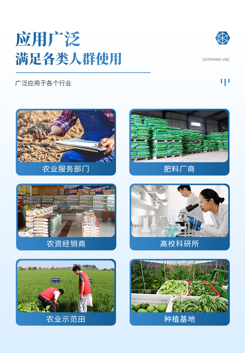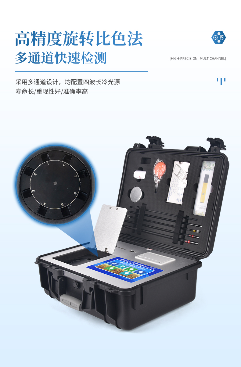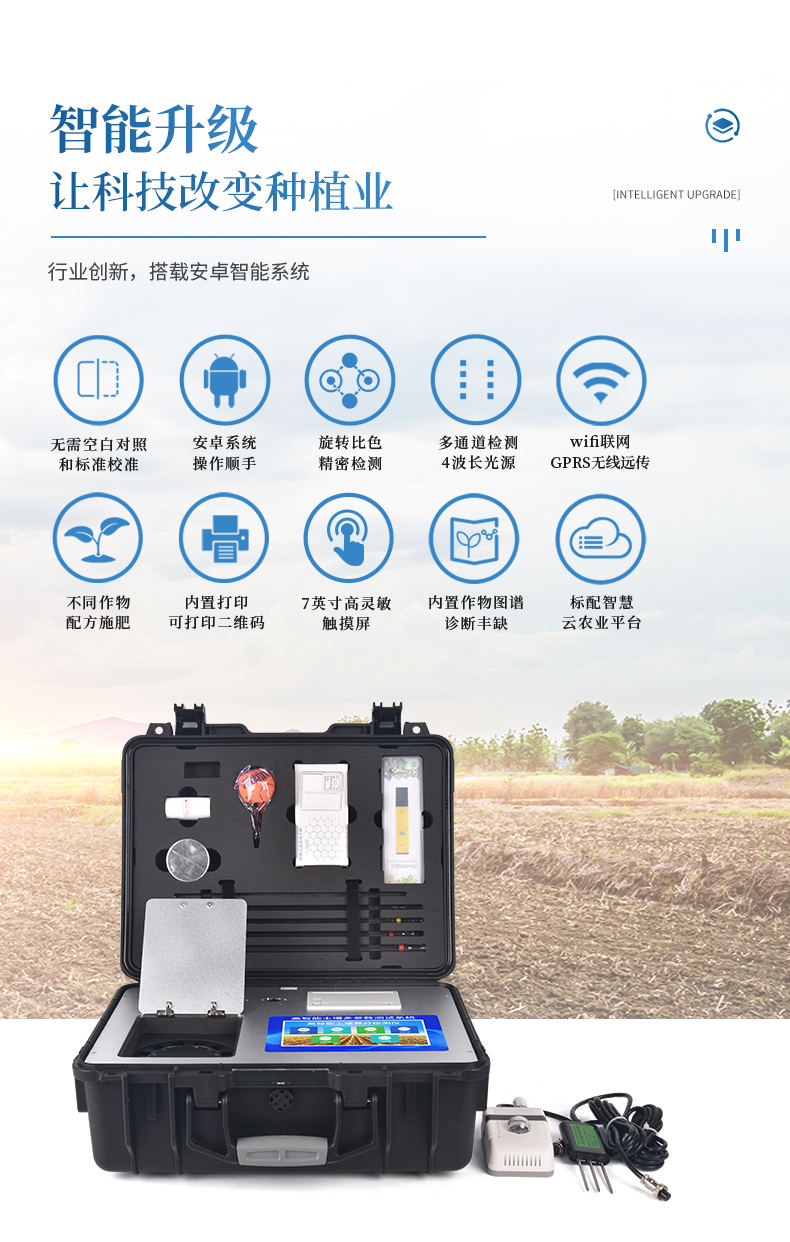 配套齊全:該儀器集藥、器、儀為一體,攜帶方便,相當(dāng)于一個(gè)小型移動(dòng)實(shí)驗(yàn)室,無(wú)需用戶自配附件,亦可靈活野外流動(dòng)測(cè)試。適于農(nóng)業(yè)服務(wù)部門(mén)或農(nóng)資經(jīng)銷商、合作社、肥料廠商、大種植戶測(cè)土施肥。