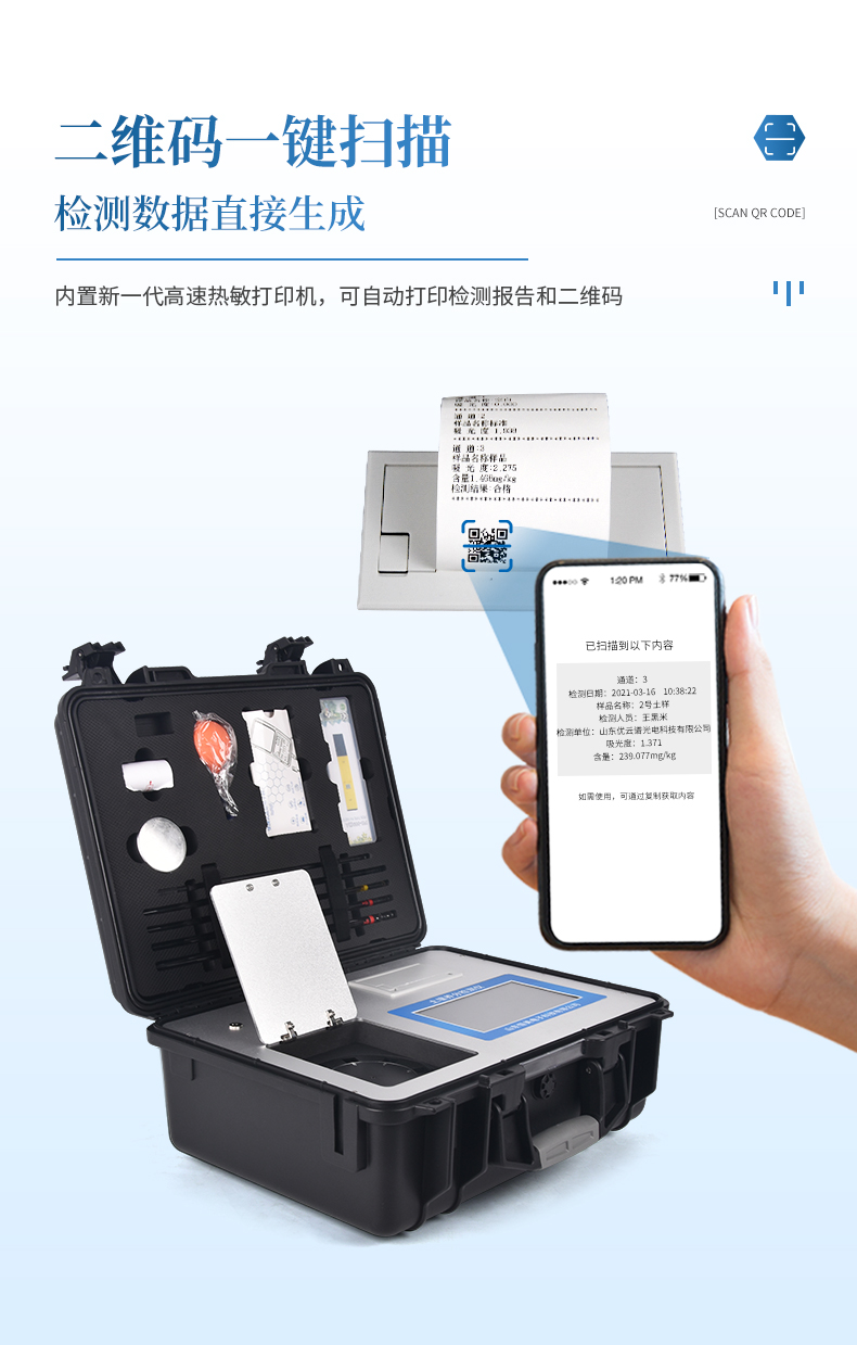 15、內(nèi)置新一代高速熱敏打印機(jī)(無(wú)需色帶),打印內(nèi)容包含:檢測(cè)單位、檢測(cè)人員、檢測(cè)項(xiàng)目、通道號(hào)、吸光度、養(yǎng)分含量(mg/kg)、檢測(cè)時(shí)間、以及二維碼等信息