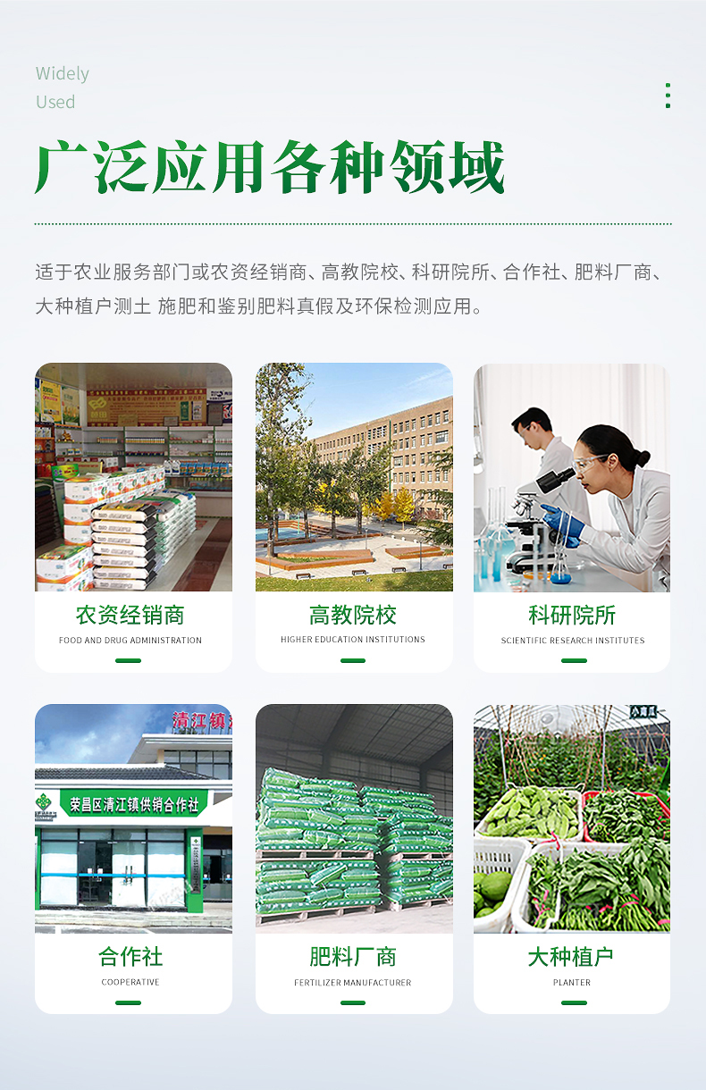 配套齊全:該儀器集藥、器、儀為一體,攜帶方便,相當于一個小型移動實驗室,無需用戶自配附件,亦可靈活野外流動測試。適于農(nóng)業(yè)服務(wù)部門或農(nóng)資經(jīng)銷商、高教院校、科研院所、合作社、肥料廠商、大種植戶測土施肥和鑒別肥料真假及環(huán)保檢測應(yīng)用。