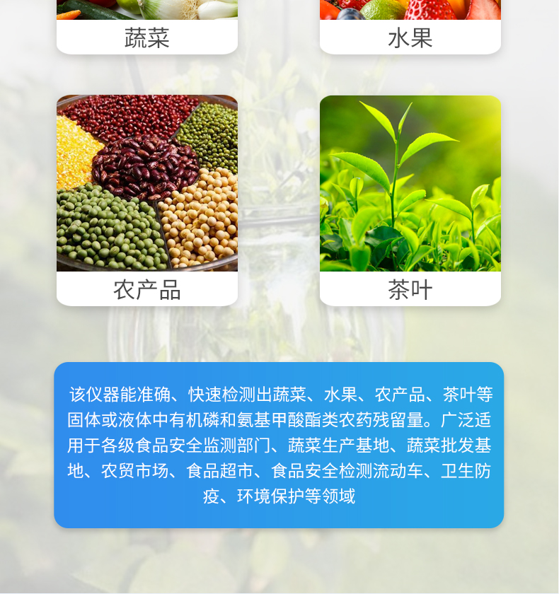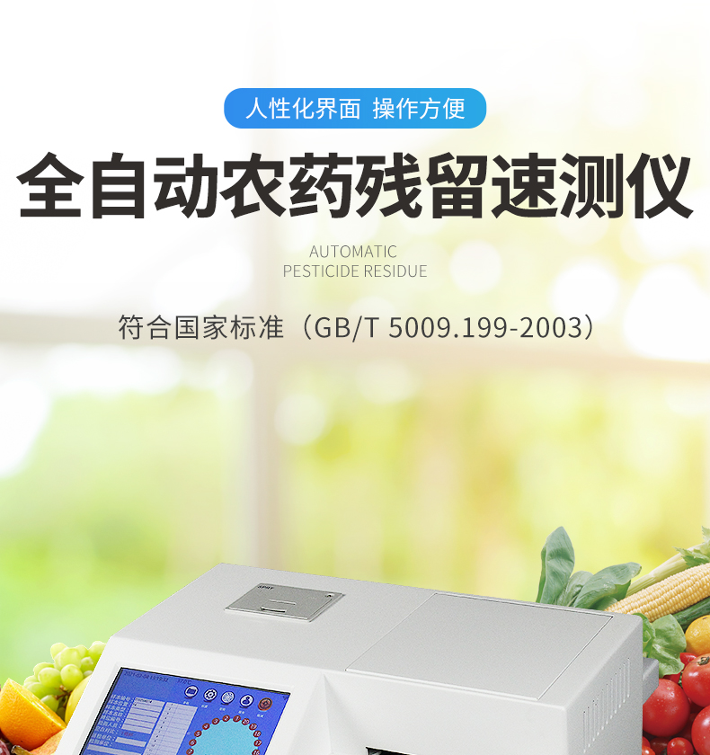 該儀器依據(jù)國(guó)家標(biāo)準(zhǔn)(GB/T 5009.199-2003)和農(nóng)業(yè)標(biāo)準(zhǔn)方法(NY/T 448-2001)中的酶抑制率法設(shè)計(jì)制造,能準(zhǔn)確、快速檢測(cè)出蔬菜、水果、農(nóng)產(chǎn)品、茶葉等固體或液體中有機(jī)磷和氨基甲酸酯類農(nóng)藥殘留量。廣泛適用于各級(jí)食品安全監(jiān)測(cè)部門、蔬菜生產(chǎn)基地、蔬菜批發(fā)基地、農(nóng)貿(mào)市場(chǎng)、食品超市、食品安全檢測(cè)流動(dòng)車、衛(wèi)生防疫、環(huán)境保護(hù)等領(lǐng)域。