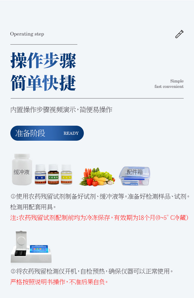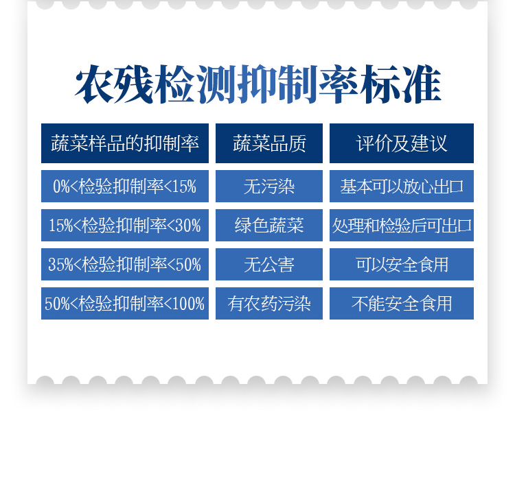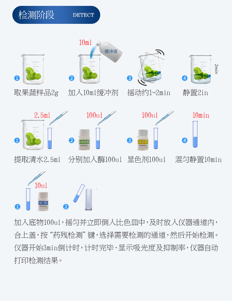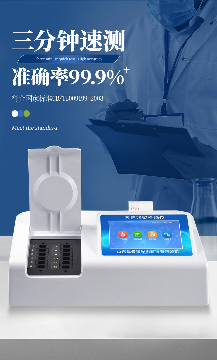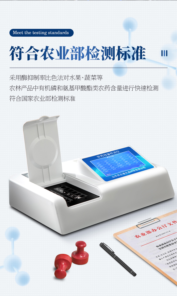 檢測標準:依據(jù)國家標準方法(GB/T5009.199-2003)以及世界衛(wèi)生組織WHO、世界糧農(nóng)組織FAO殘留農(nóng)藥檢測標準、世界環(huán)境保護局EPA參照攝入量等要求來設計。采用酶抑制率比色法對水果、蔬菜等農(nóng)林產(chǎn)品中有機磷和氨基甲酸酯類農(nóng)藥含量進行快速準確的檢測。
