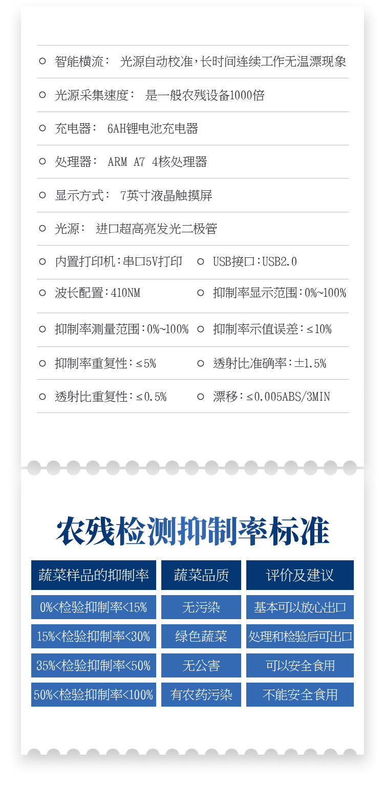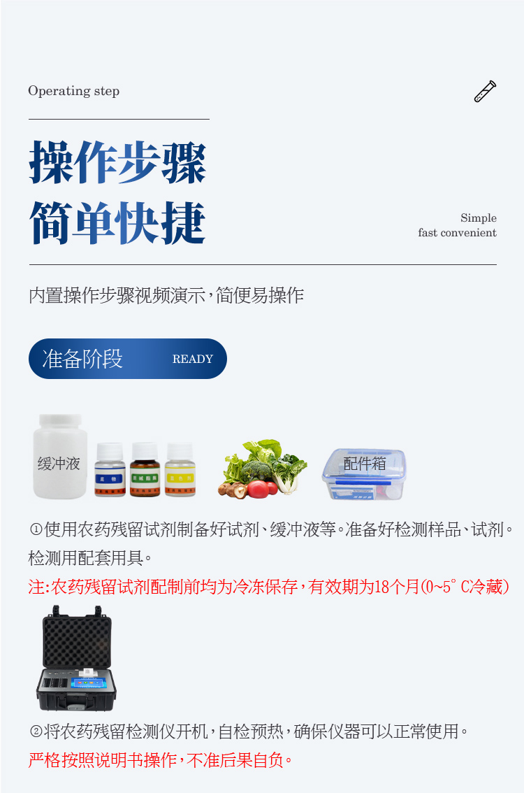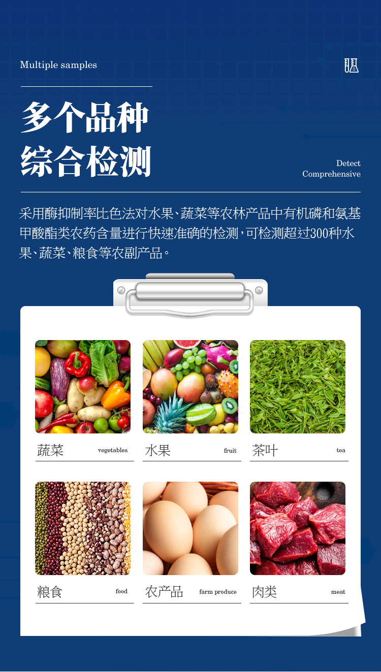 檢測(cè)標(biāo)準(zhǔn):依據(jù)國(guó)家標(biāo)準(zhǔn)方法(GB/T5009.199-2003)以及世界衛(wèi)生組織WHO、世界糧農(nóng)組織FAO殘留農(nóng)藥檢測(cè)標(biāo)準(zhǔn)、世界環(huán)境保護(hù)局EPA參照攝入量等要求來設(shè)計(jì)。采用酶抑制率比色法對(duì)水果、蔬菜等農(nóng)林產(chǎn)品中有機(jī)磷和氨基甲酸酯類農(nóng)藥含量進(jìn)行快速準(zhǔn)確的檢測(cè),乙酰膽堿酯酶和丁酰膽堿酯酶試劑均可以使用,符合國(guó)家標(biāo)準(zhǔn)和農(nóng)業(yè)部標(biāo)準(zhǔn)的要求。