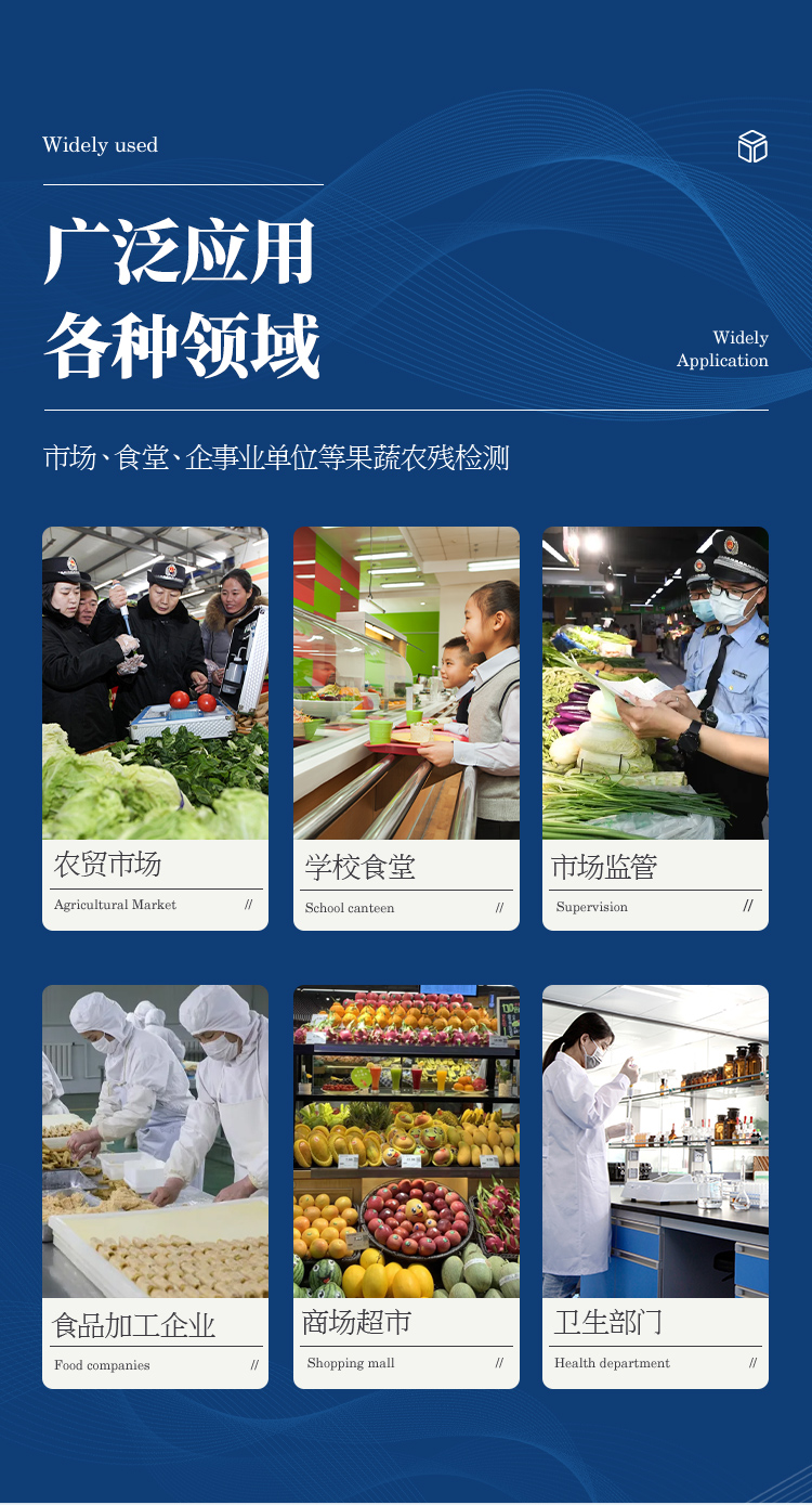 廣泛應(yīng)用于主要用于蔬菜、水果、茶葉、糧食、農(nóng)副產(chǎn)品等食品中有機(jī)磷和氨基甲酸酯類農(nóng)藥殘留的快速檢測(cè);此外還可用于果蔬茶生產(chǎn)基地和農(nóng)貿(mào)批發(fā)銷售市場(chǎng)現(xiàn)場(chǎng)檢測(cè),餐館、學(xué)校、食堂、家庭果蔬加工前的安全速測(cè)等。