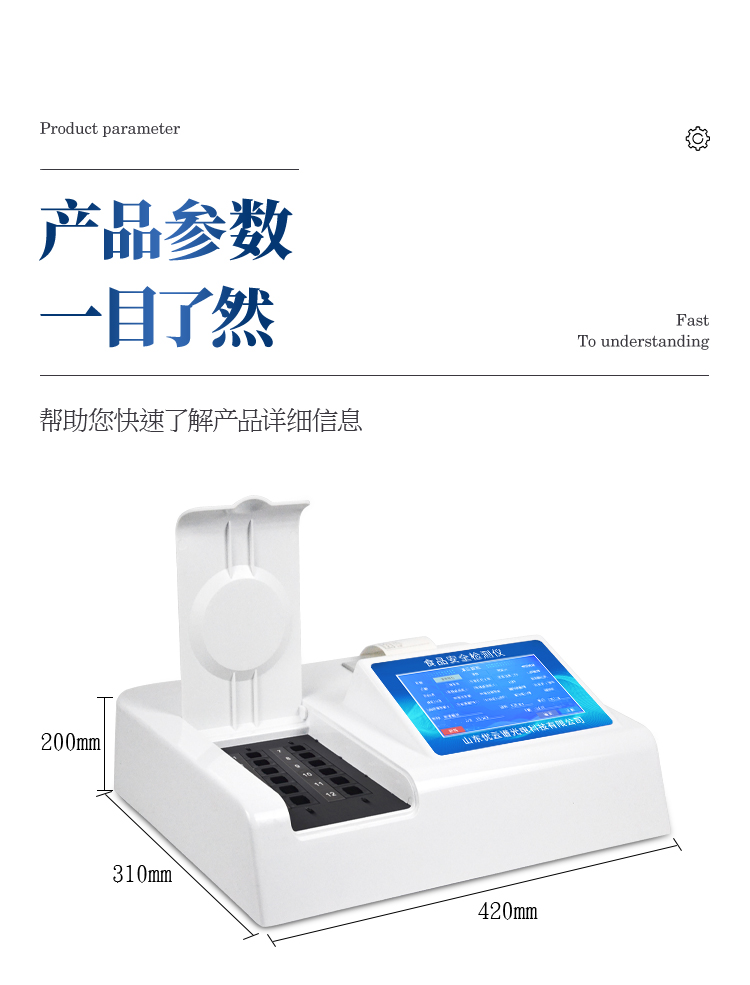 多功能食品安全檢測儀可快速檢測60多項目,包含:濫用食品添加劑、非食用化學物質(zhì)、農(nóng)藥殘留、重金屬含量、病害肉成分、營養(yǎng)強化劑、化學類殘留、食用油脂檢測、水酒飲品分析、調(diào)味品成分、食用色素等現(xiàn)場的定性定量檢測。