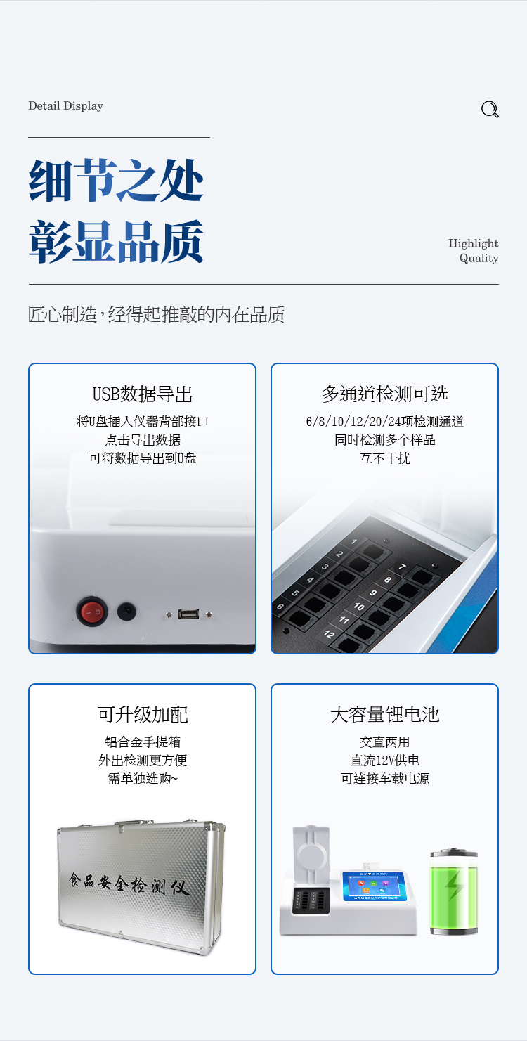 可快速檢測各類食品中的甲醛、二氧化硫、亞硝酸鹽的含量,儀器預(yù)留其他項(xiàng)目檢測程序和端口,根據(jù)日后需求可方便的自主增加檢測項(xiàng)目。