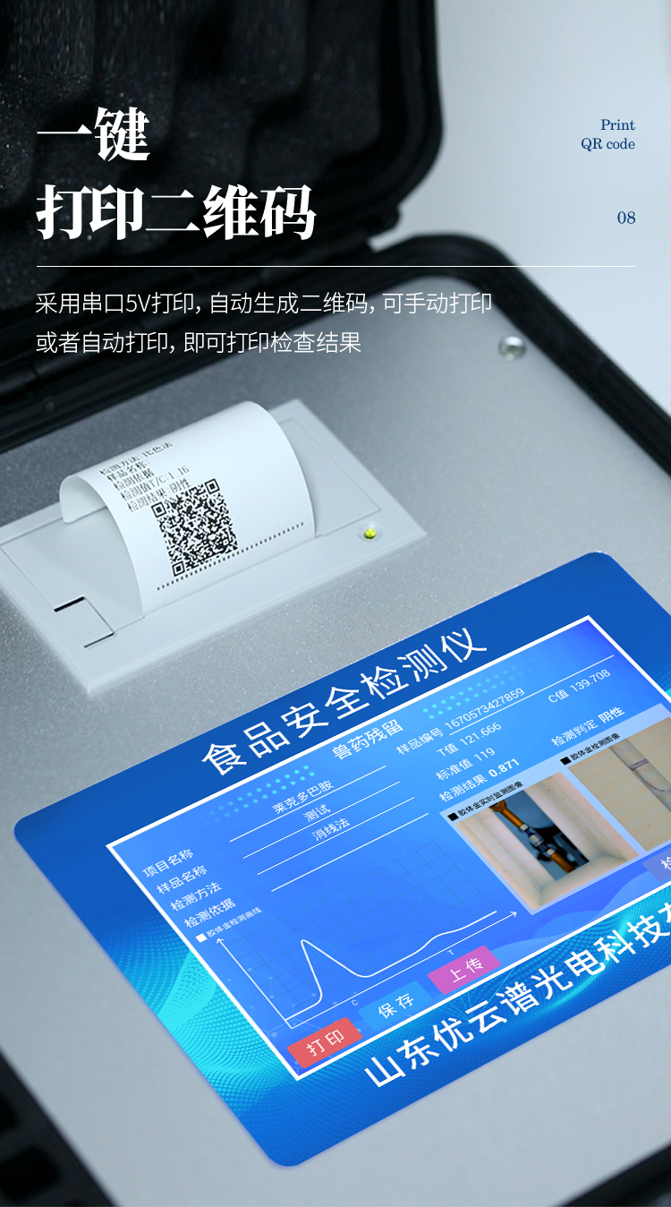 13、新一代高速熱敏打印機(jī),檢測(cè)完成可自動(dòng)打印或批量打印檢測(cè)報(bào)告和二維碼。