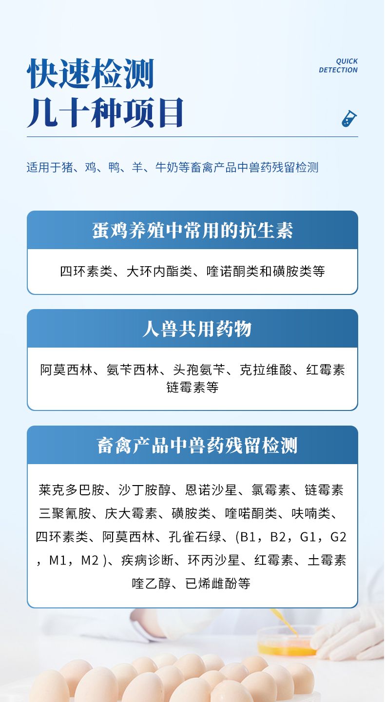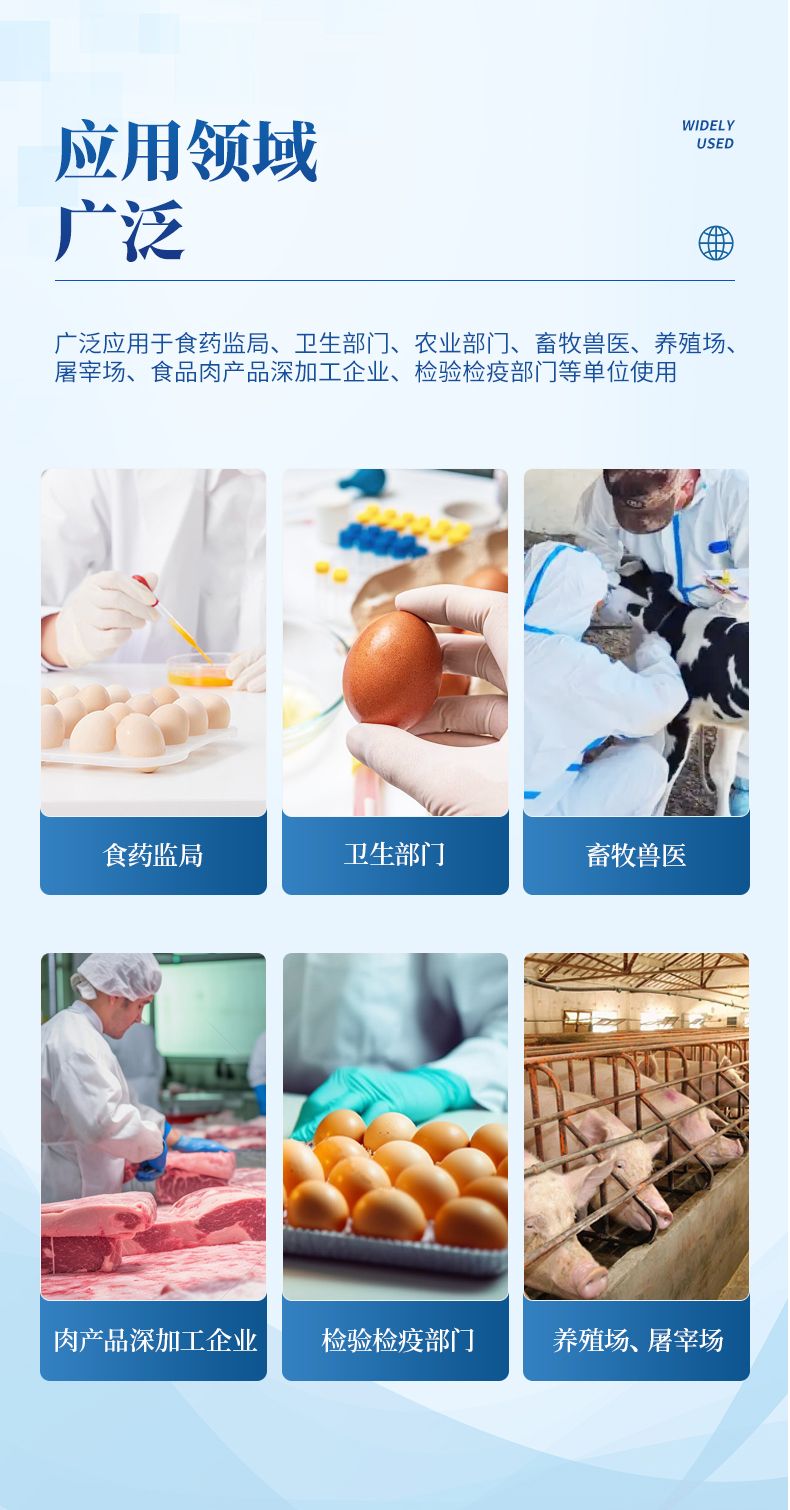 雞蛋抗生素檢測儀可適用于豬、雞、鴨、羊、牛奶等畜禽產(chǎn)品中獸藥殘留檢測,如、萊克多巴胺、沙丁胺醇、恩諾沙星、氯霉素、鏈霉素、三聚氰胺、慶大霉素、磺胺類、喹喏酮類、呋喃類、四環(huán)素類、阿莫西林、孔雀石綠、(B1,B2,G1,G2,M1,M2 )、疾病診斷、環(huán)丙沙星、紅霉素、土霉素、喹乙醇、已烯雌酚等。并廣泛應用于廣泛應用于食藥監(jiān)局、衛(wèi)生部門、農(nóng)業(yè)部門、畜牧獸醫(yī)、養(yǎng)殖場、屠宰場、食品肉產(chǎn)品深加工企業(yè)、檢驗檢疫部門等單位使用。