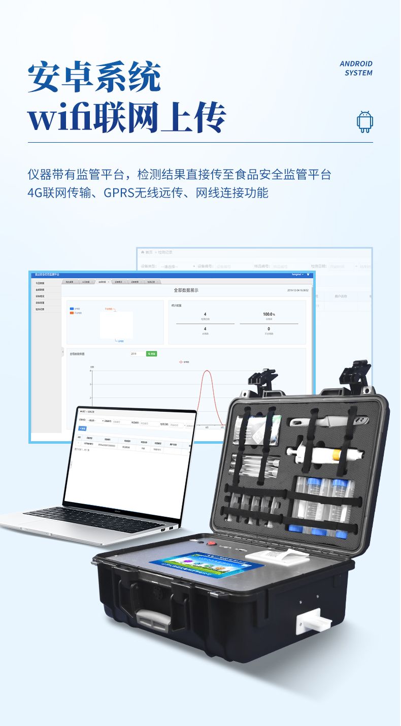 4、儀器帶有監(jiān)管平臺,數(shù)據(jù)可局域網(wǎng)和互聯(lián)網(wǎng)數(shù)據(jù)上傳,檢測結(jié)果直接傳至食品安全監(jiān)管平臺。進行區(qū)域食品安全監(jiān)管及大數(shù)據(jù)分析處理與數(shù)據(jù)統(tǒng)計,檢測區(qū)域食品安全長短期動態(tài),達到食品安全問題預估、預警