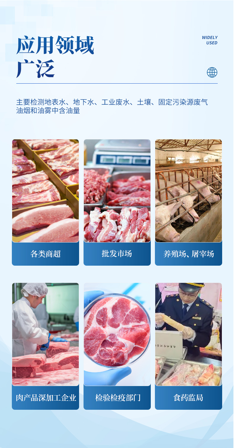 該多功能肉類檢測儀為集成化肉品安全快速檢測分析設備,廣泛應用于養(yǎng)殖場、屠宰場、食品肉產品深加工企業(yè)、檢驗檢疫部門、食藥監(jiān)局、衛(wèi)生部門、高教院校、科研院所、農業(yè)部門等單位使用。