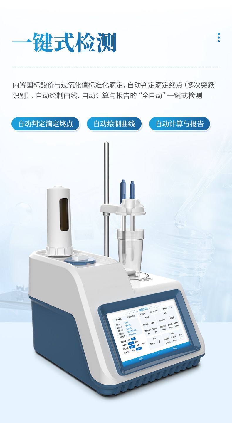 3.內置國標酸價與過氧化值標準化滴定,自動判定滴定終點(多次突躍識別)、自動繪制曲線、自動計算與報告的“全自動”一鍵式檢測;