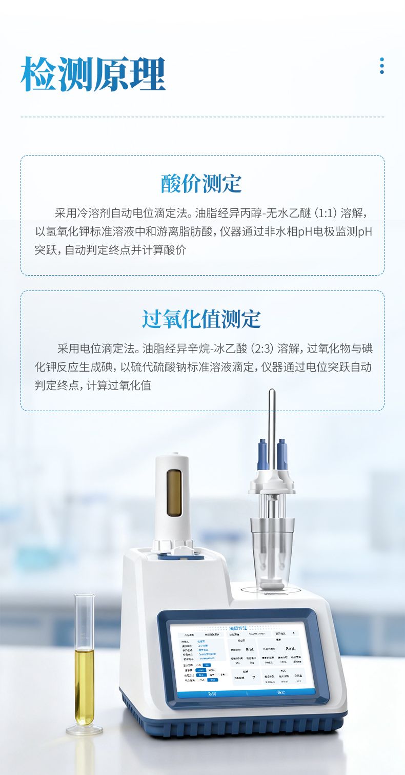 過氧化值測定:采用電位滴定法。油脂經(jīng)異辛烷-冰乙酸(2:3)溶解,過氧化物與碘化鉀反應生成碘,以硫代硫酸鈉標準溶液滴定,儀器通過電位突躍自動判定終點,計算過氧化值。