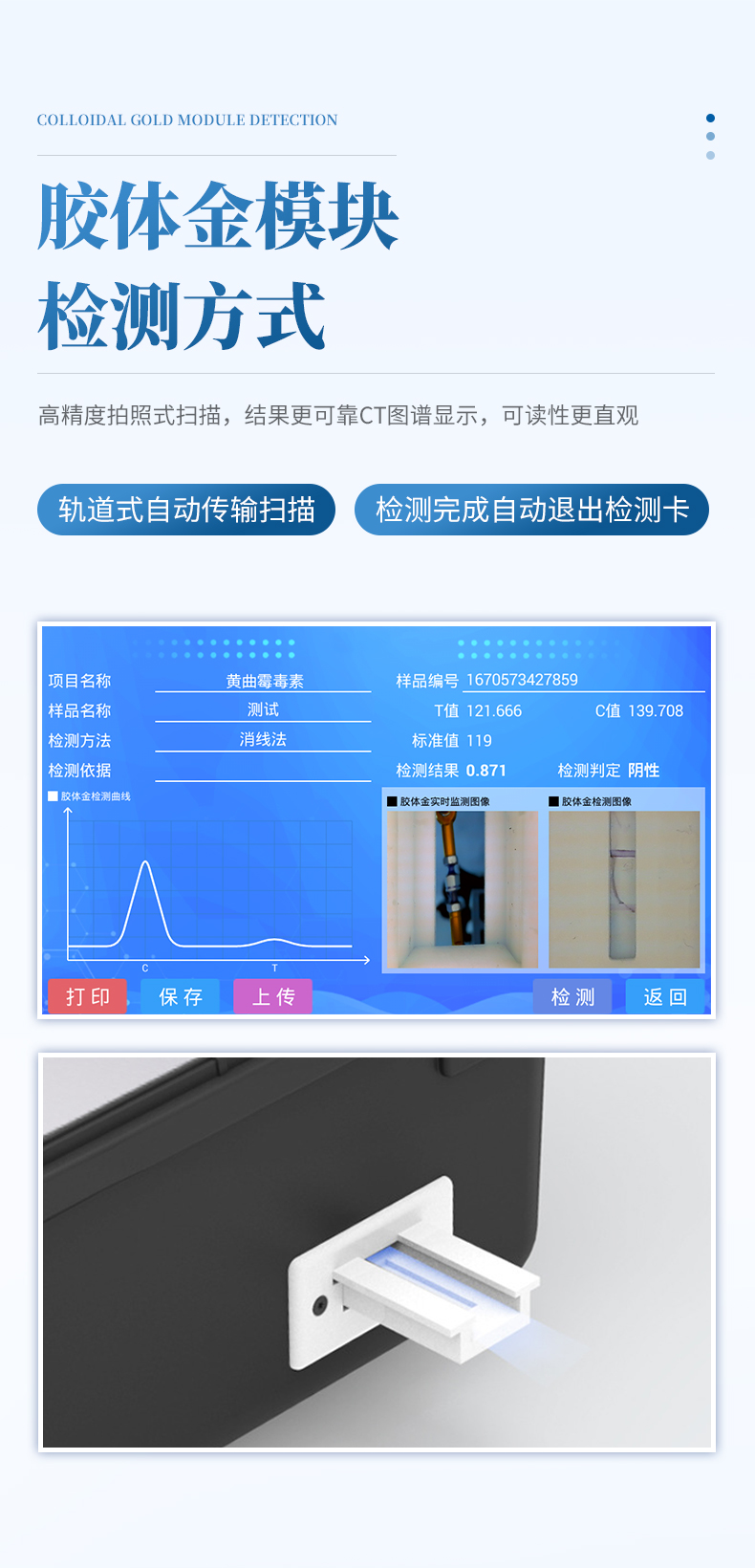 6、膠體金模塊檢測(cè)方式:軌道式自動(dòng)傳輸掃描,檢測(cè)完成后自動(dòng)退出檢測(cè)卡。