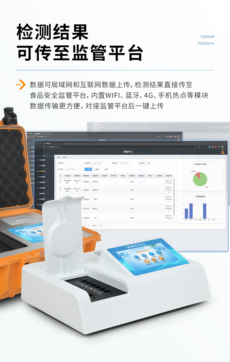 8、儀器帶有監(jiān)管平臺(tái)。數(shù)據(jù)可局域網(wǎng)和互聯(lián)網(wǎng)數(shù)據(jù)上傳,檢測(cè)結(jié)果直接傳至食品安全監(jiān)管平臺(tái)。進(jìn)行區(qū)域食品安全監(jiān)管及大數(shù)據(jù)分析處理,檢測(cè)區(qū)域食品安全長(zhǎng)短期動(dòng)態(tài),達(dá)到食品安全問(wèn)題預(yù)估、預(yù)警。