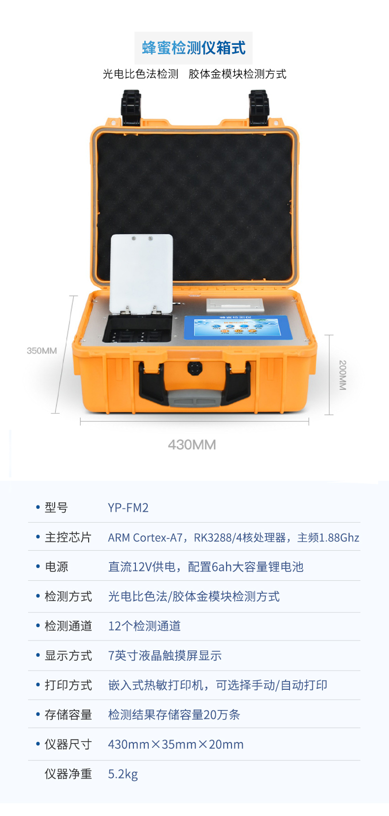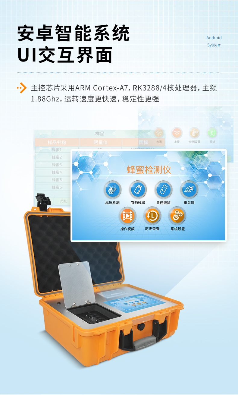 檢測(cè)項(xiàng)目:蜂蜜蔗糖、蜂蜜還原糖(葡萄糖和果糖)、蜂蜜羥甲基糠醛、蜂蜜酸度、蜂蜜中農(nóng)藥殘留、蜂蜜淀粉酶值、蜂蜜中脯氨酸、蜂蜜水分、蜂蜜糖分、蜂蜜中灰分,應(yīng)用范圍:應(yīng)用于現(xiàn)場(chǎng)檢測(cè)蜂蜜蔗糖、葡萄糖和果糖、羥甲基糠醛、酸度、農(nóng)殘、淀粉酶、脯氨酸、水分、糖分、灰分含量的蜂蜜快速檢測(cè)儀,可廣泛應(yīng)用于各類蜂蜜品質(zhì)的快速定量檢測(cè)。