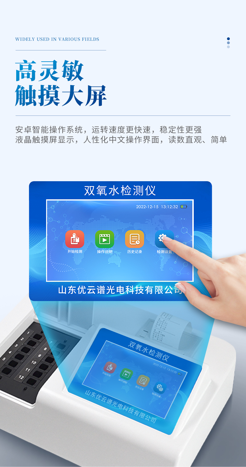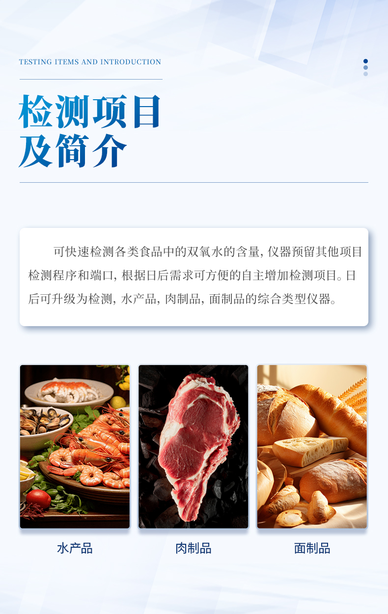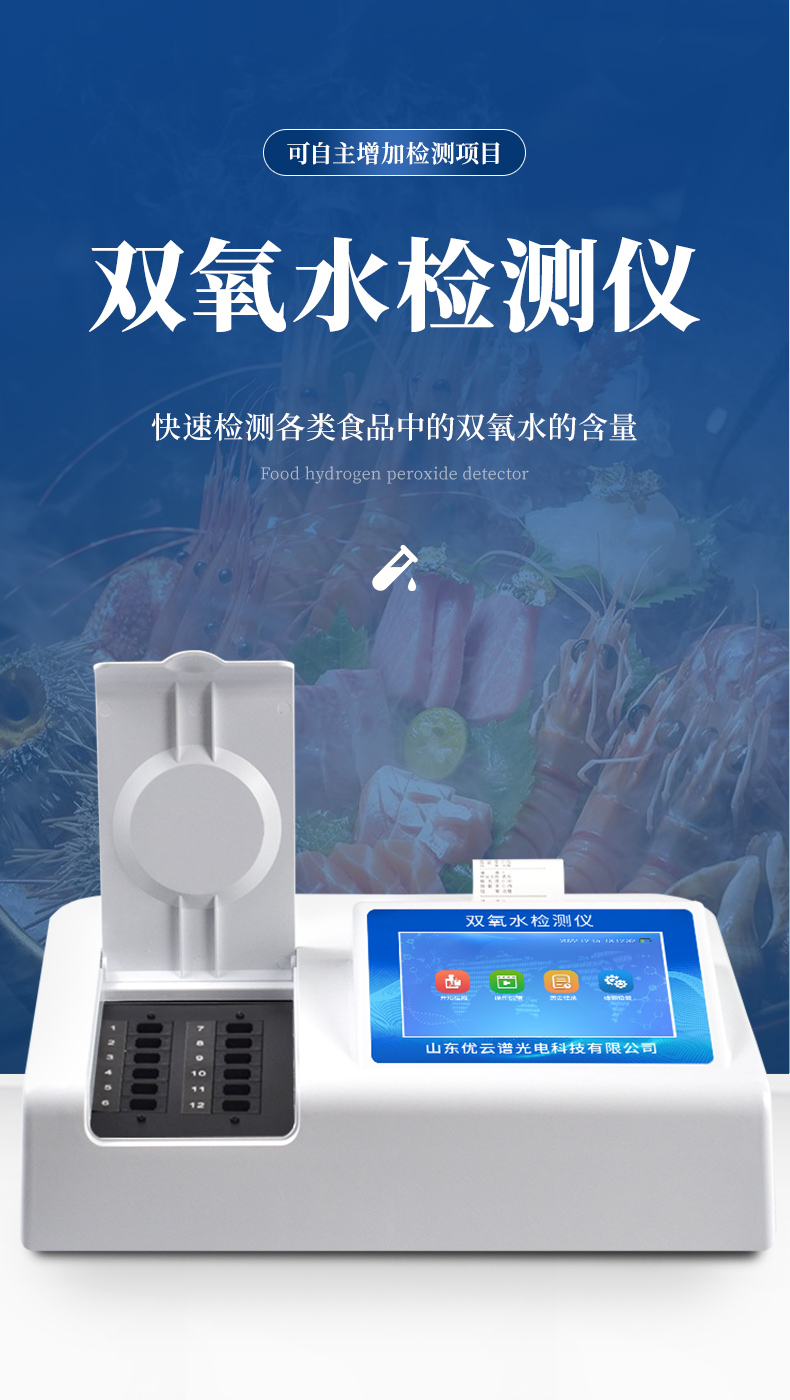 1、檢測項目:可快速檢測各類食品中的雙氧水的含量,儀器預(yù)留其他項目檢測程序和端口,根據(jù)日后需求可方便的自主增加檢測項目。日后可升級為檢測,水產(chǎn)品,肉制品,面制品的綜合類型儀器。