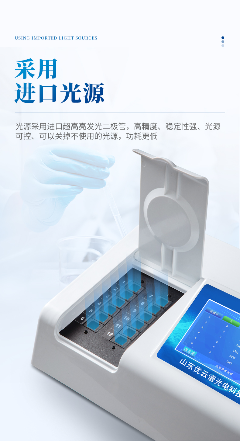 5、光源采用進口超高亮發(fā)光二極管,高精度、穩(wěn)定性強、光源可控、可以關(guān)掉不使用的光源,功耗更低。