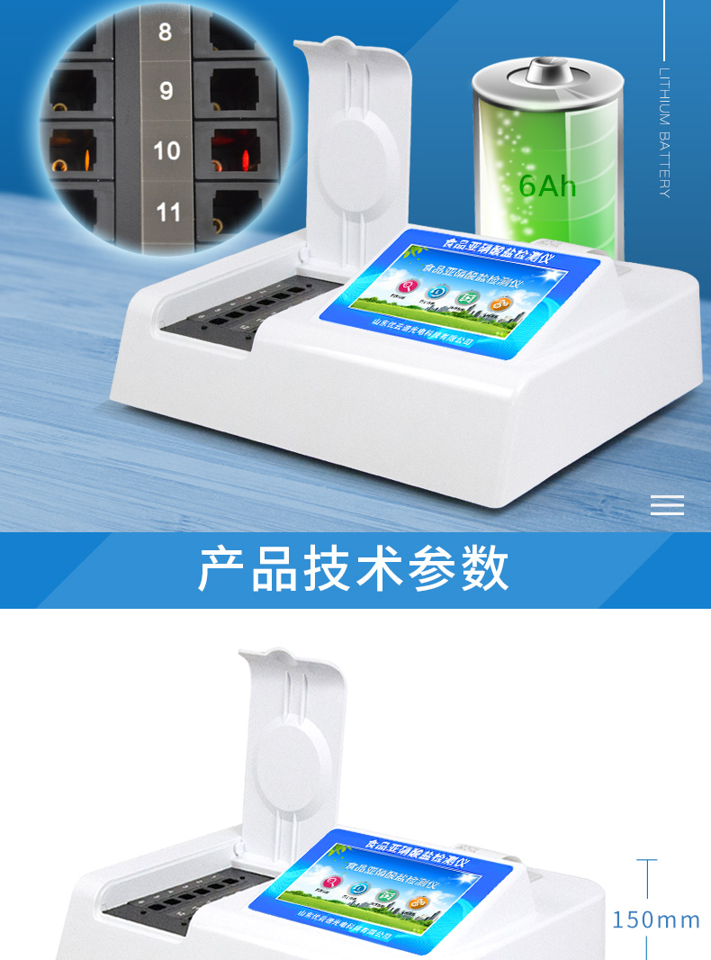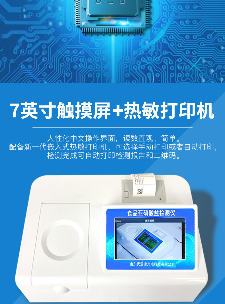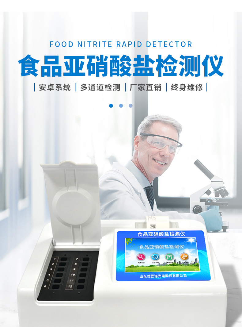 YP-Y12食品中亞硝酸鹽快速檢測儀為集成化食品安全檢測分析設(shè)備,能夠快速檢測肉類、肉類罐頭、熏肉、香腸、奶制品、泡菜、腌制蔬菜等中的亞硝酸鹽含量;該儀器是根據(jù)GB5009.33-2010《食品中亞硝酸鹽與硝酸鹽的測定》,食品中的亞硝酸鹽經(jīng)過提取,與檢測試劑反應生成有色化合物,再利用亞硝酸鹽檢測儀測定其吸光度,在一定范圍內(nèi)吸光度與含量成正比。通過檢測可確定食品是否符合國家標準或是否為超標毒害食品等。儀器預留其他項目檢測程序和端口,根據(jù)日后需求可方便的自主增加檢測項目。日后可升級為檢測水產(chǎn)品、面制品的綜合類型儀器。