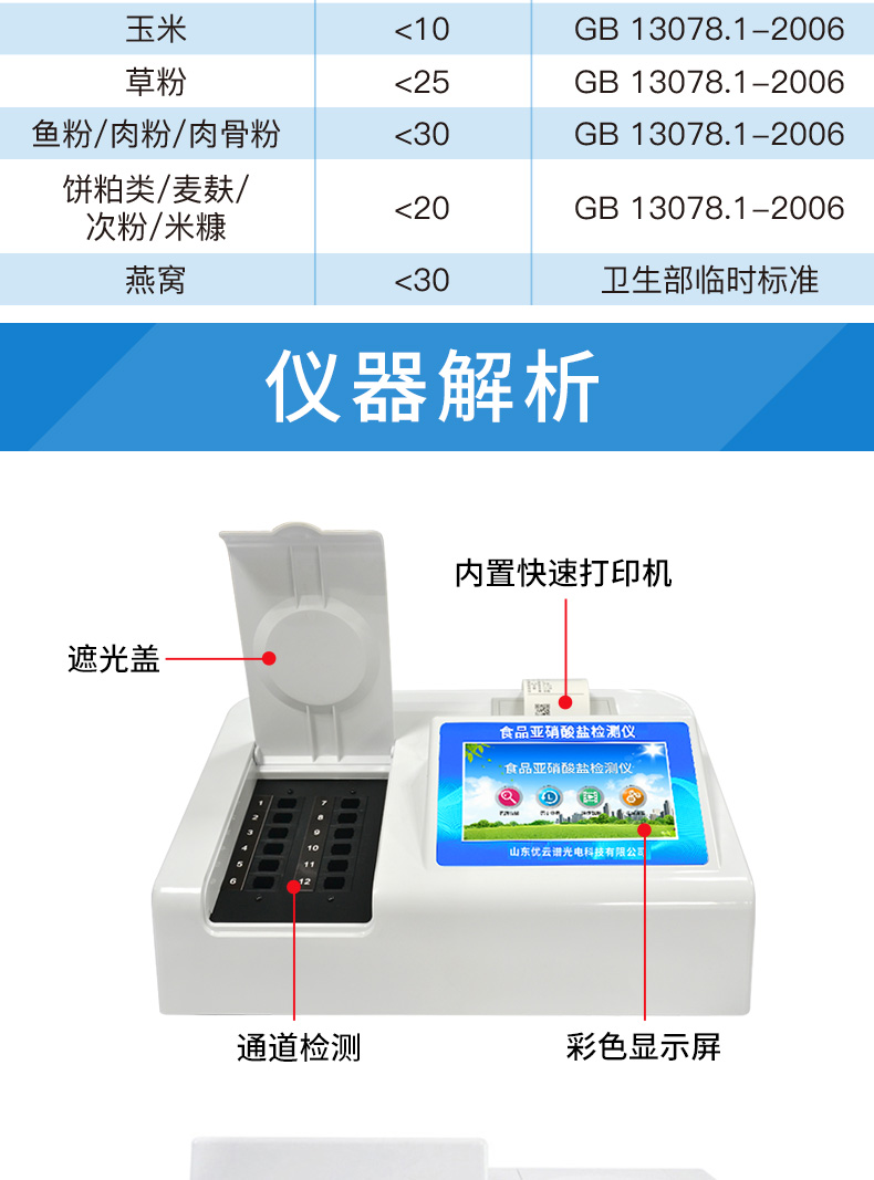 7、內(nèi)置新國家限量標準,與所測結(jié)果進行現(xiàn)場比對,并持續(xù)更新標準。