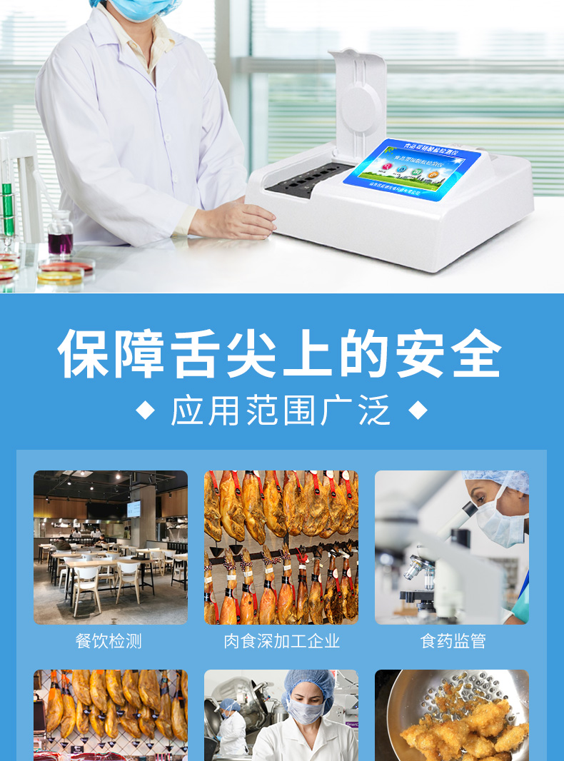 廣泛應用于餐飲檢測、食藥監(jiān)局、衛(wèi)生部門、肉制品食品深加工企業(yè)、商場超市、質(zhì)量監(jiān)督檢驗、工商管理、油炸食品生產(chǎn)基地、各大食品安全監(jiān)測系統(tǒng)等單位使用。