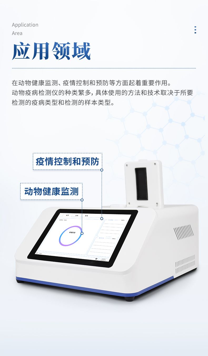 動物/寵物疫病檢測儀是一種用于檢測動物身體樣本中是否存在病原體或疫病的設備。它在動物健康監(jiān)測、疫情控制和預防等方面起著重要作用。動物疫病檢測儀的種類繁多,具體使用的方法和技術取決于所要檢測的疫病類型和檢測的樣本類型。