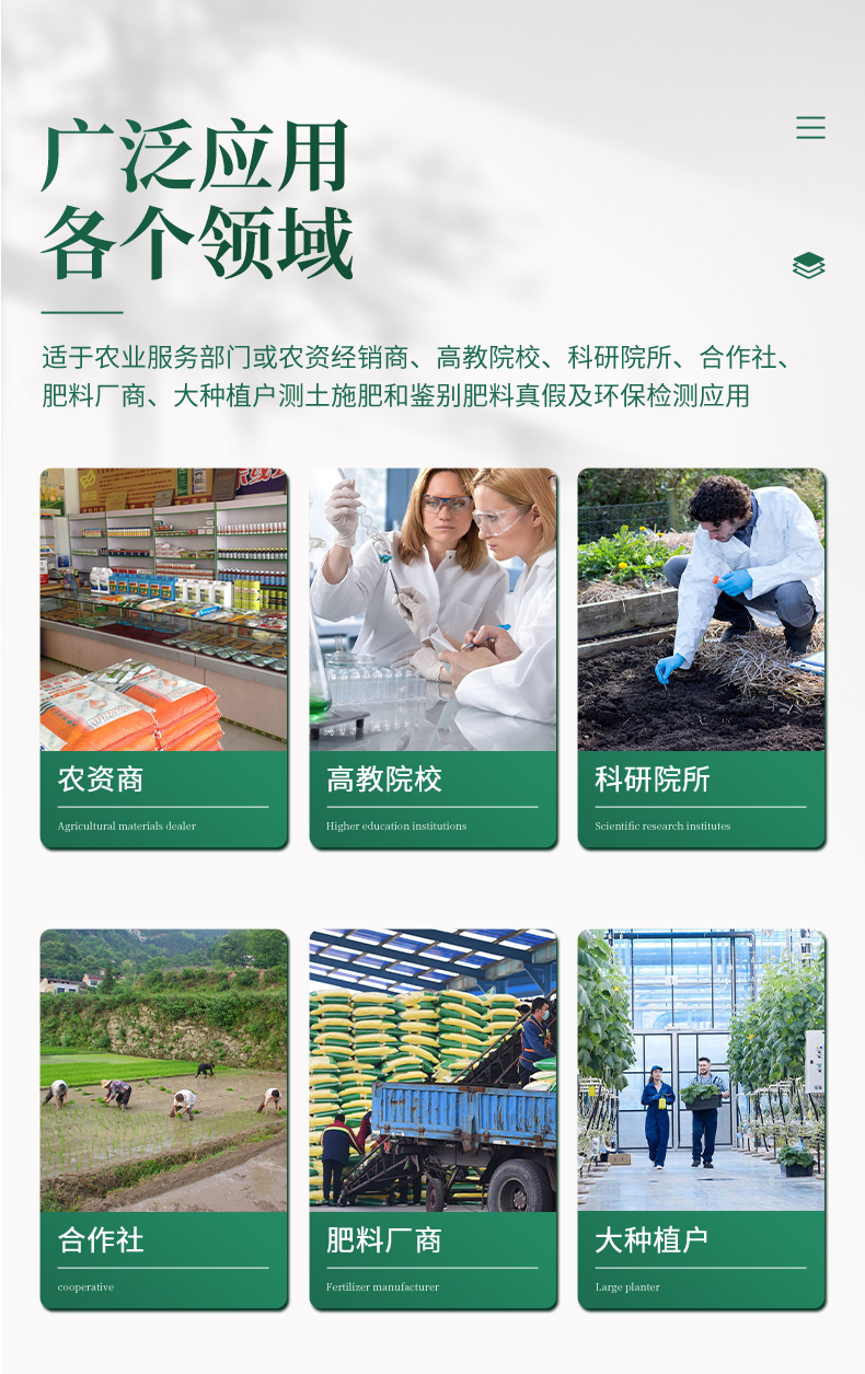 土壤養(yǎng)分:●銨態(tài)氮、硝態(tài)氮、速效磷、速效鉀、有機(jī)質(zhì)、全氮、堿解氮、pH值、含鹽量、水分等十項(xiàng); ● 中微量元素:鈣、鎂、硫、鐵、錳、硼、鋅、銅、氯、硅、鉬等。