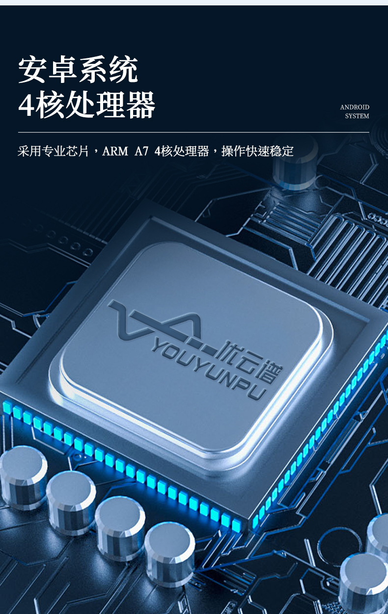 1、主控芯片采用ARM Cortex-A7,RK3288/4核處理器,主頻1.88Ghz,運轉(zhuǎn)速度更快速,穩(wěn)定性更強。