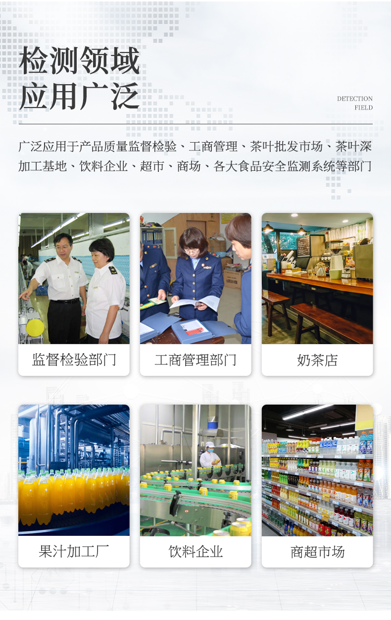7、一體化便攜式快檢設(shè)備,滿足現(xiàn)場及流動檢測使用需求,能夠在同一軟件下實現(xiàn)所有檢測項目的檢測,并可通過同一窗口直觀顯示檢測結(jié)果。