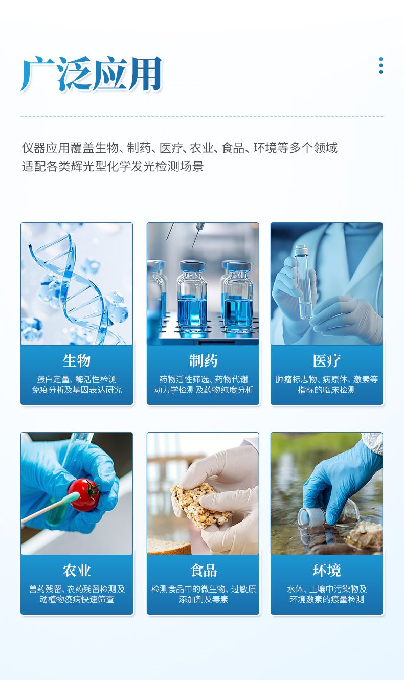 儀器應(yīng)用覆蓋生物、制藥、醫(yī)療、農(nóng)業(yè)、食品、環(huán)境等多個(gè)領(lǐng)域,適配各類輝光型化學(xué)發(fā)光檢測場景。