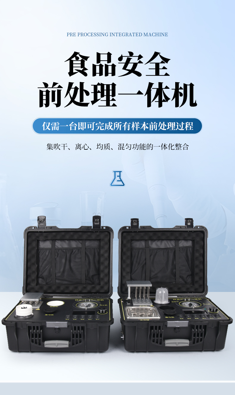 QC4型四合一樣品檢測(cè)前處理一體機(jī)(箱)是集吹干、離心、均質(zhì)、混勻功能的一體化整合,極大的簡(jiǎn)化和集中樣品前處理的一般操作過(guò)程,結(jié)合移動(dòng)便攜的工程塑料箱體,特別適合農(nóng)獸藥殘留畜禽水產(chǎn)品質(zhì)量安全現(xiàn)場(chǎng)快速檢測(cè)。