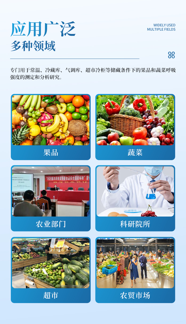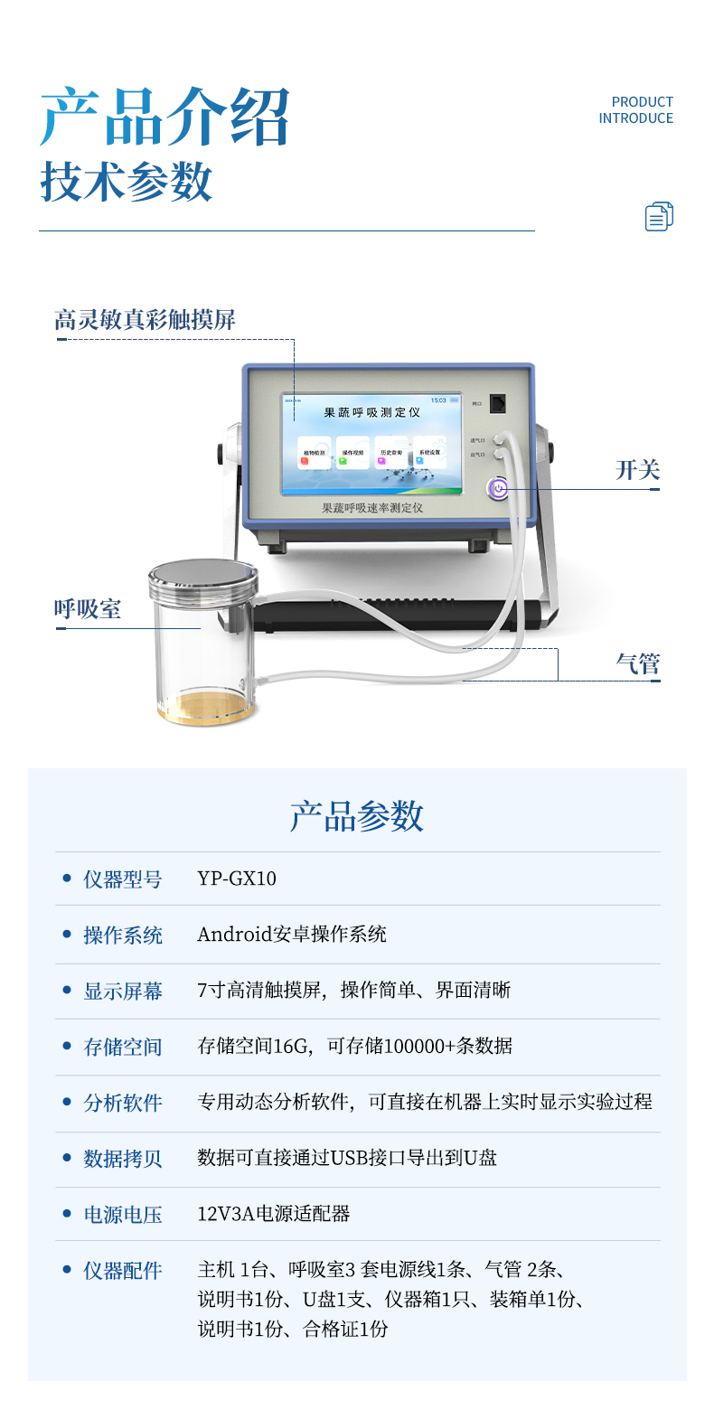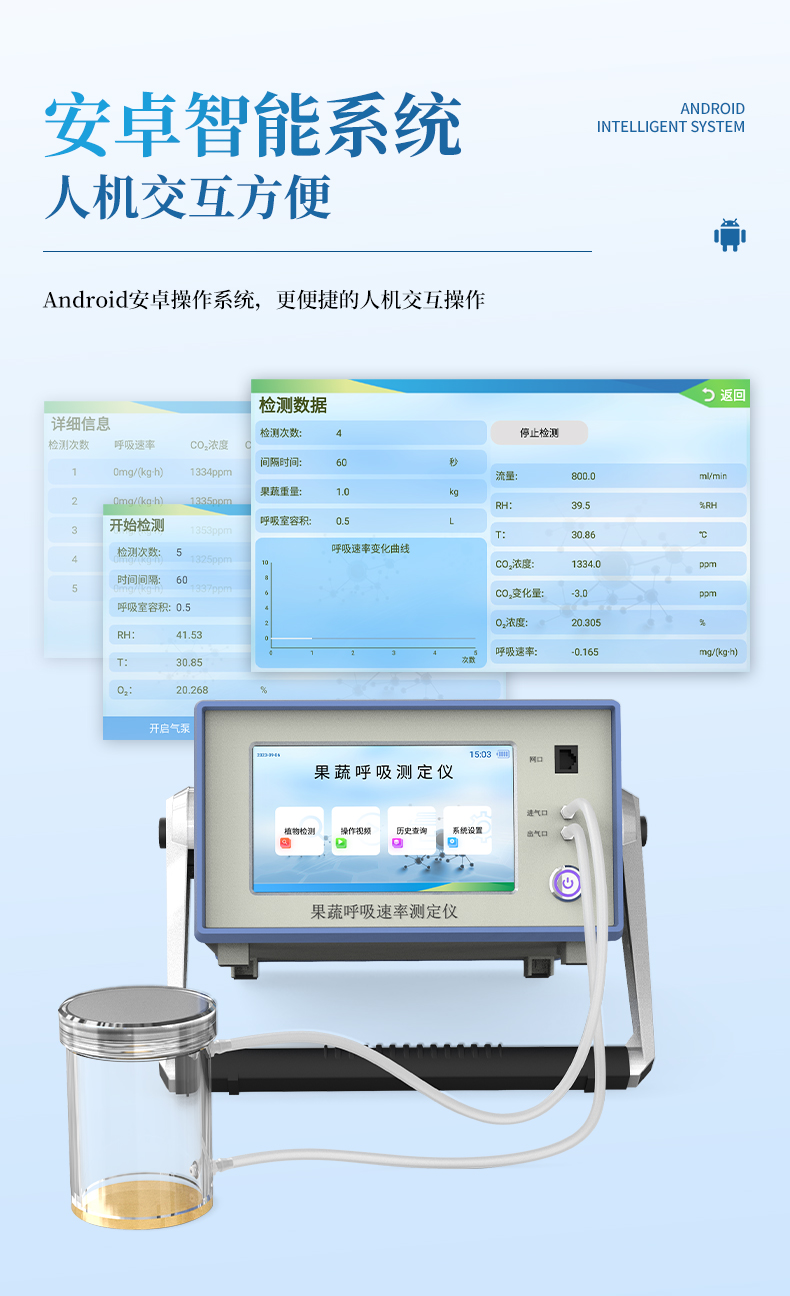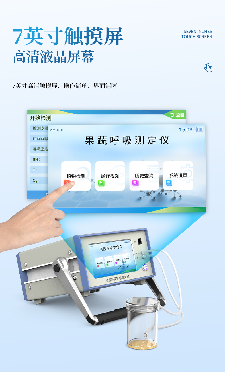 果蔬呼吸儀采用雙波長紅外二氧化碳分析器,7寸安卓顯示器,專門用于常溫、冷藏庫、氣調(diào)庫、超市冷柜等儲藏條件下的果品和蔬菜呼吸強度的測定和分析研究。