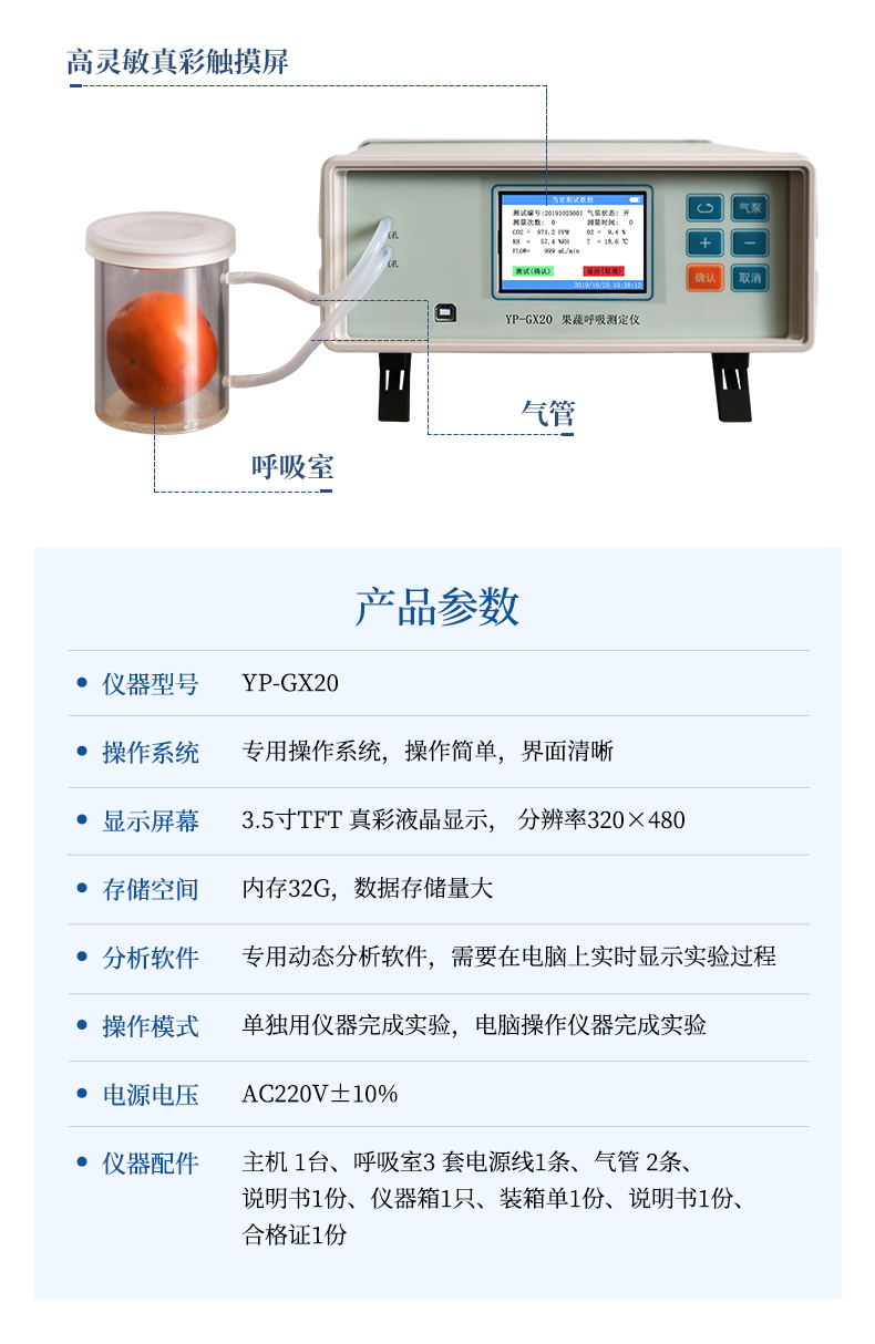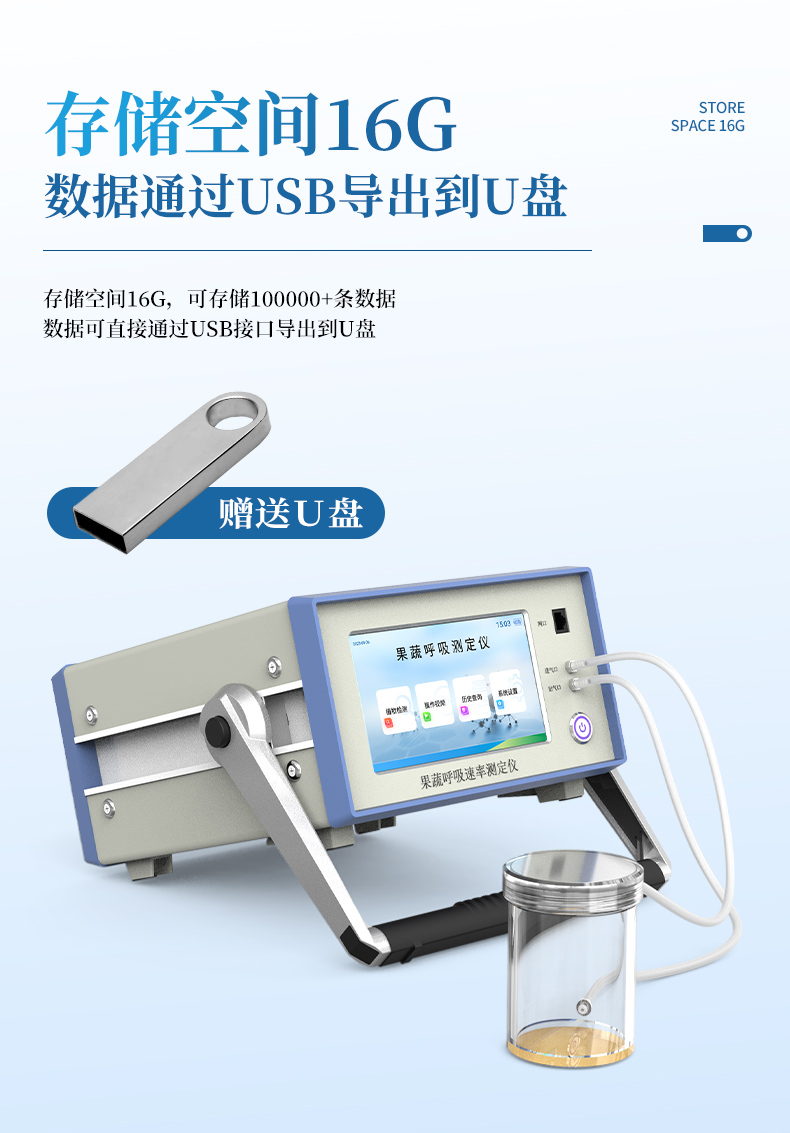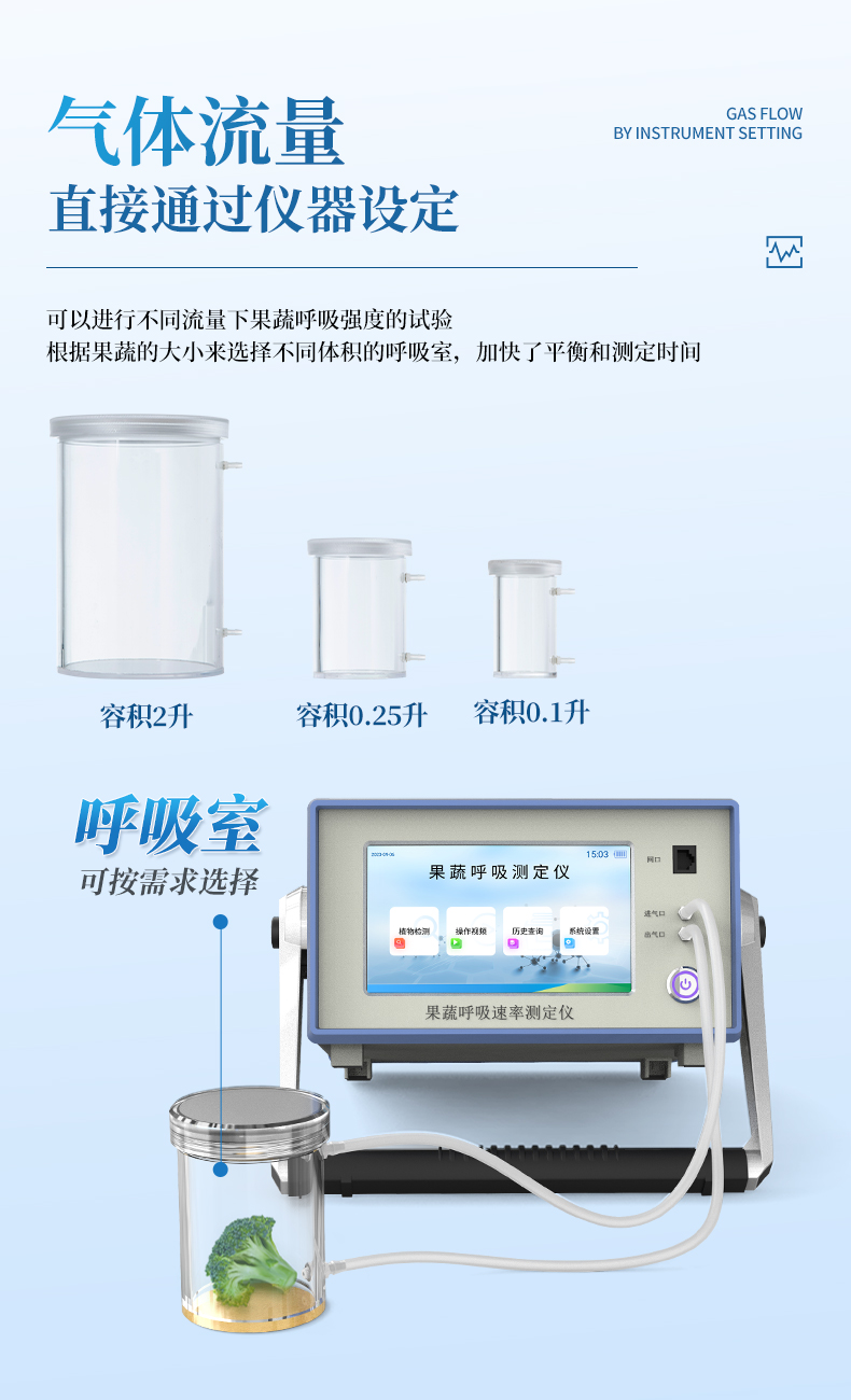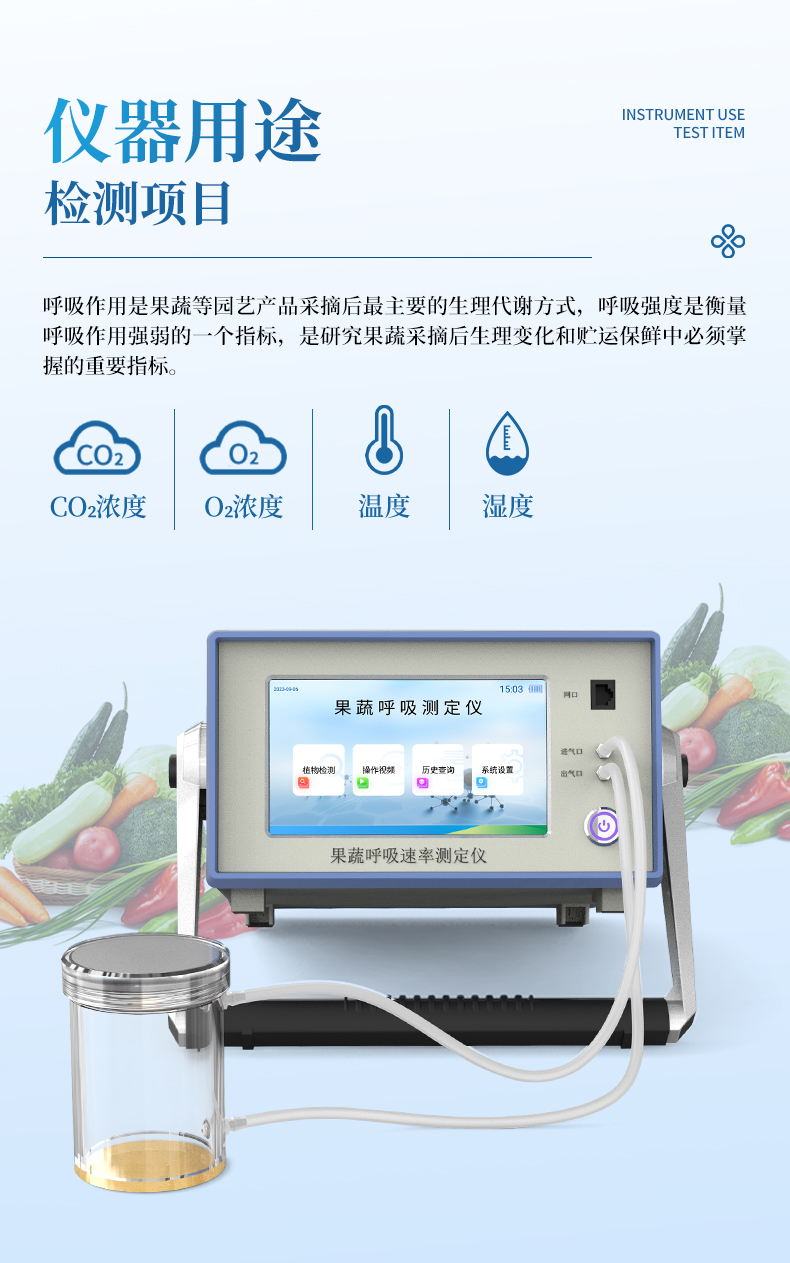 該儀器的特點是可以根據(jù)果蔬的大小來選擇不同體積的呼吸室,加快了平衡和測定時間;可以直接操顯示呼吸室的CO2濃度、O2濃度、溫度和濕度及變化曲線。