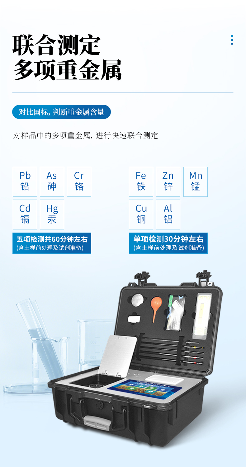 鉛、砷、鉻、鎘、汞五項檢測共60分鐘左右(含土樣前處理及試劑準(zhǔn)備)