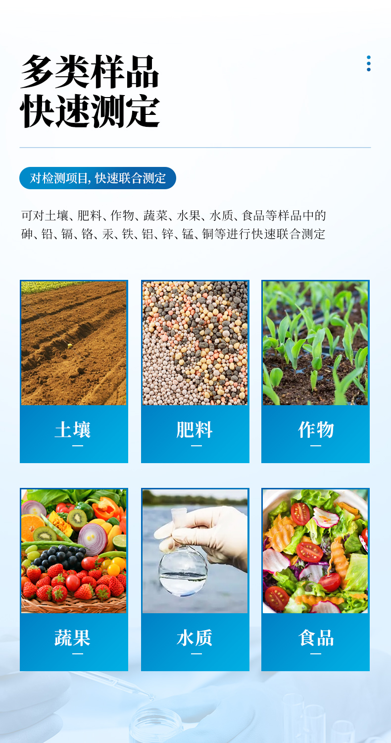 可對(duì)土壤、肥料、作物、蔬菜、水果、水質(zhì)、食品等樣品中的砷、鉛、鎘、鉻、汞、鐵、鋁、鋅、錳、銅等進(jìn)行快速聯(lián)合測(cè)定。