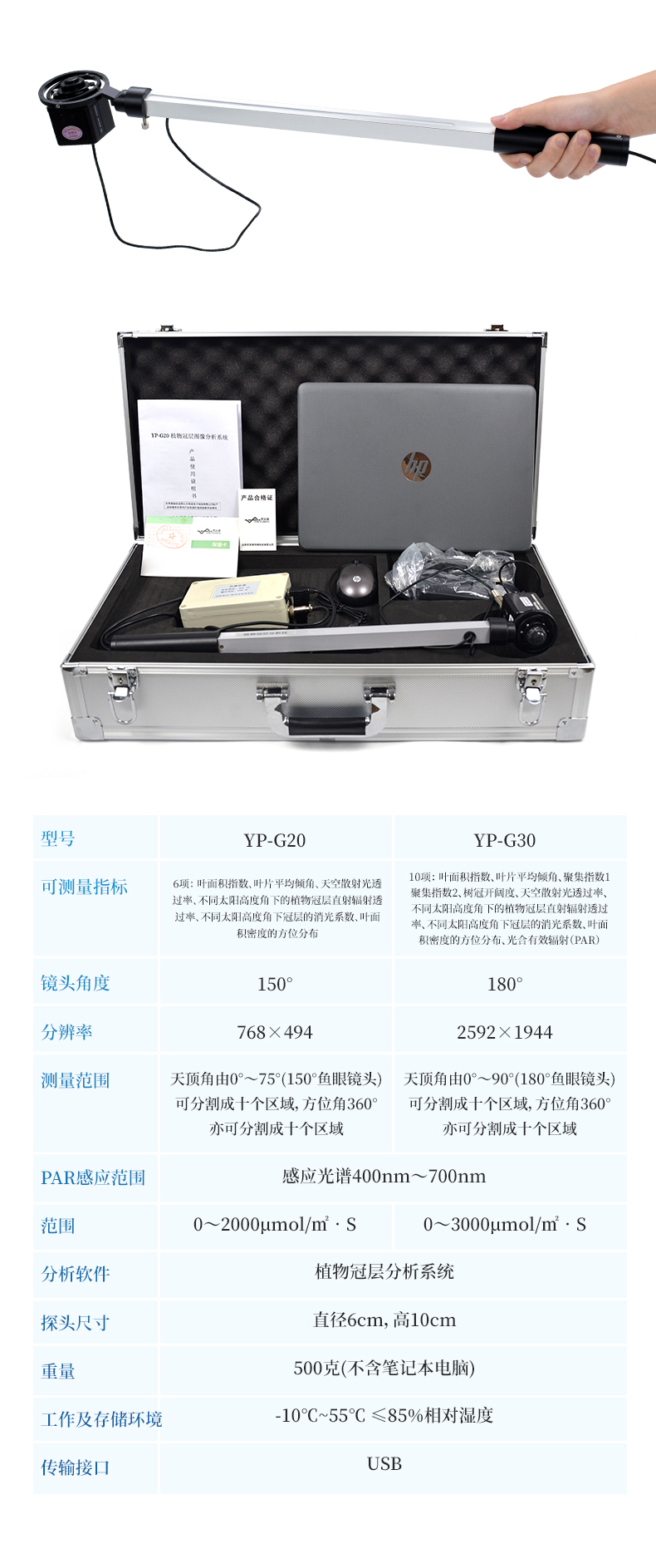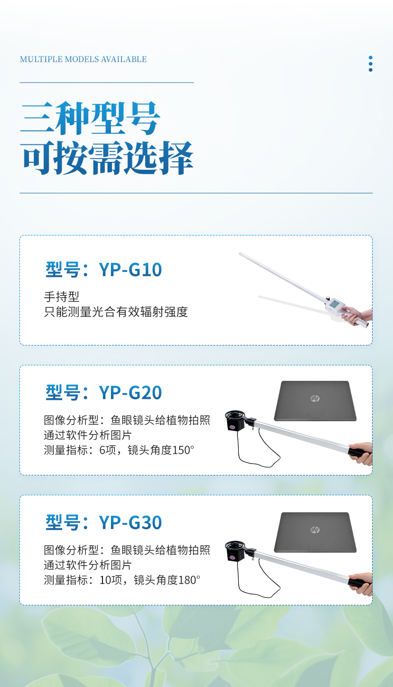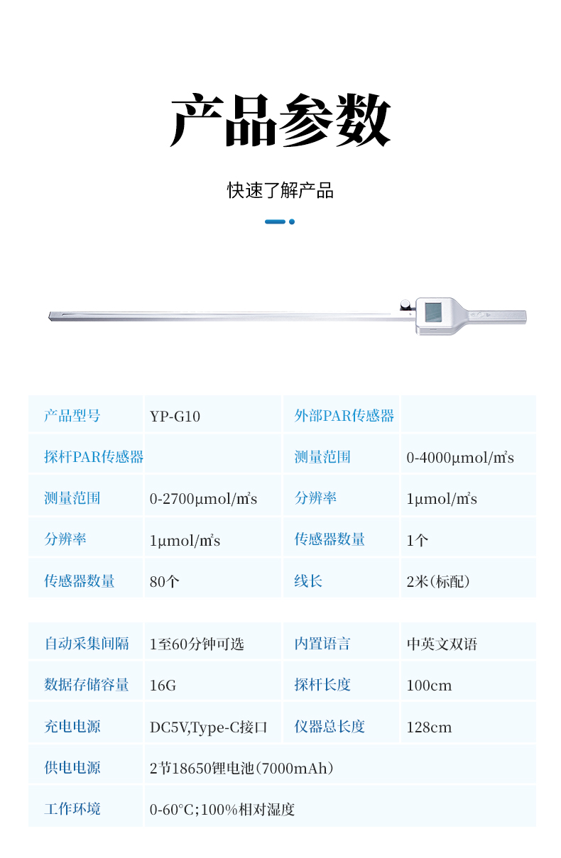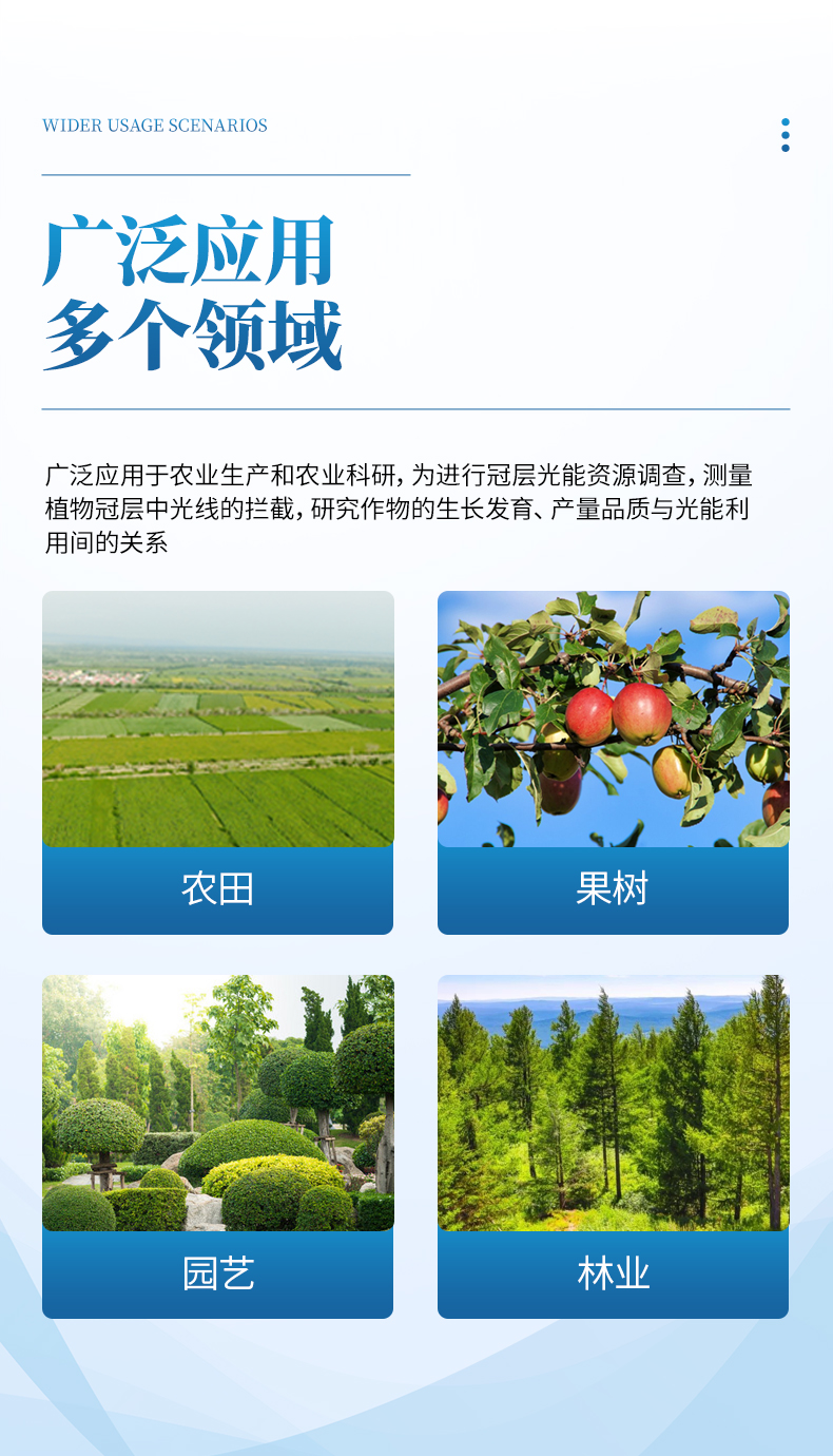 YP-G10植物冠層測(cè)量?jī)x可廣泛應(yīng)用于農(nóng)業(yè)生產(chǎn)和農(nóng)業(yè)科研,為進(jìn)行冠層光能資源調(diào)查,測(cè)量植物冠層中光線的攔截,研究作物的生長(zhǎng)發(fā)育、產(chǎn)量品質(zhì)與光能利用間的關(guān)系,本儀器用于400nm-700nm波段內(nèi)的光合有效輻射(PAR)測(cè)量、記錄,測(cè)量值的單位是平方米·秒上的微摩爾(μmol㎡/秒)。