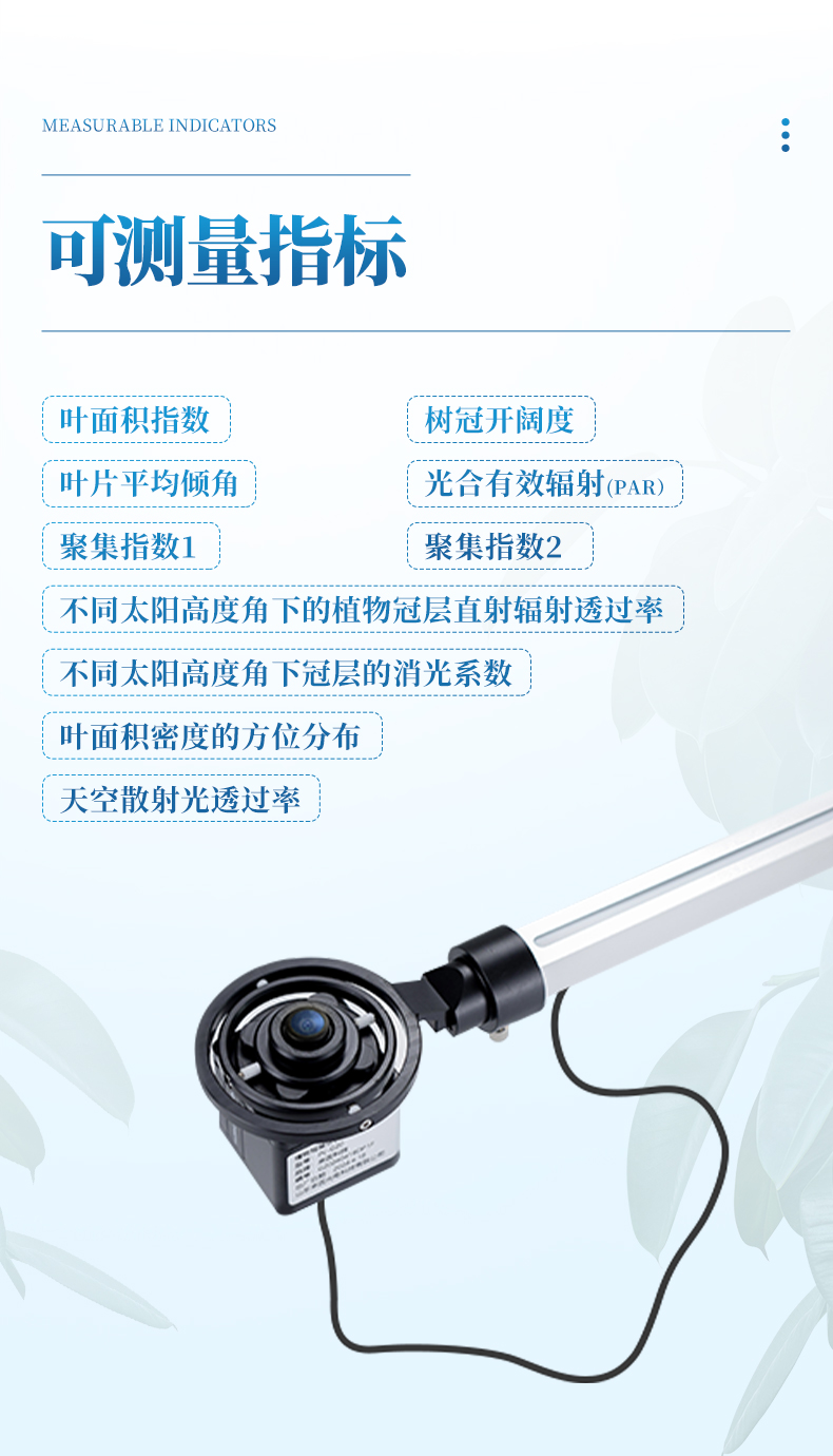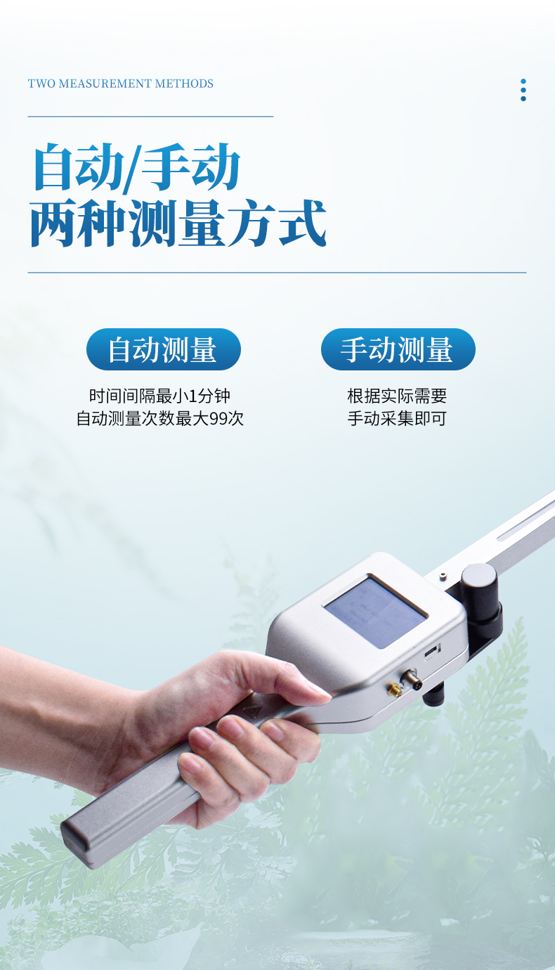 植物冠層測(cè)量?jī)x為一體化設(shè)計(jì),包括液晶顯示屏、操作按鍵、存儲(chǔ)SD卡及測(cè)量探桿等。儀器菜單操作簡(jiǎn)單,體積小,攜帶方便。存儲(chǔ)介質(zhì)為市場(chǎng)上通用的SD卡,存儲(chǔ)容量大,數(shù)據(jù)管理方便!在功耗上有合理的電源管理方案,測(cè)試過(guò)程中儀器根據(jù)實(shí)際情況自動(dòng)進(jìn)入待機(jī)狀態(tài),需要時(shí)按喚醒鍵即可喚醒屏幕,觀察實(shí)際數(shù)據(jù)。測(cè)量方式分為自動(dòng)和手動(dòng)兩種。自動(dòng)測(cè)量時(shí)間間隔最小1分鐘,自動(dòng)測(cè)量次數(shù)最大99次,手動(dòng)測(cè)量根據(jù)實(shí)際需要手動(dòng)采集即可。