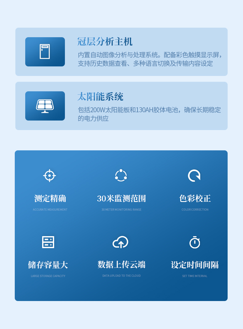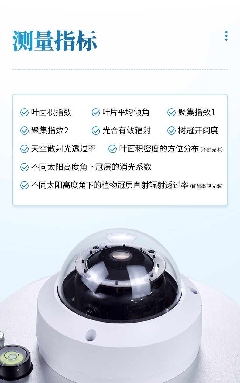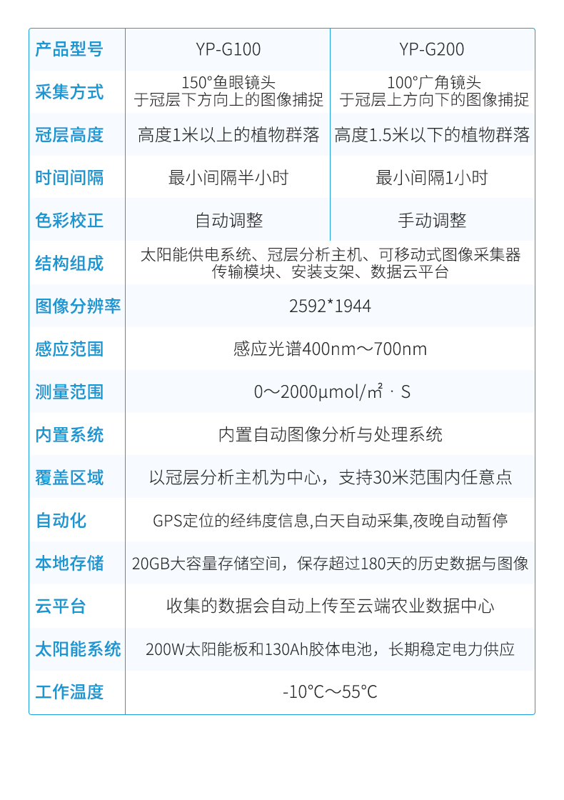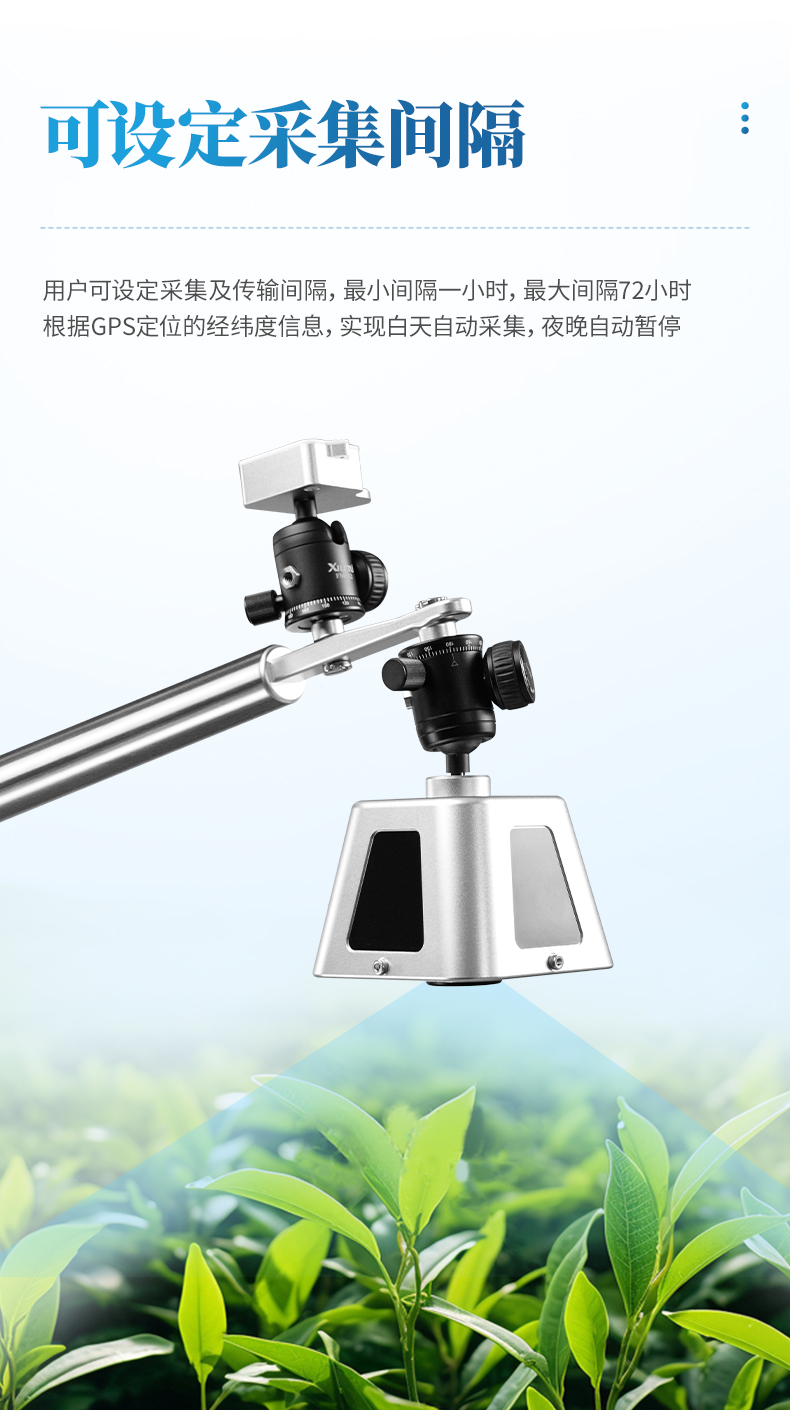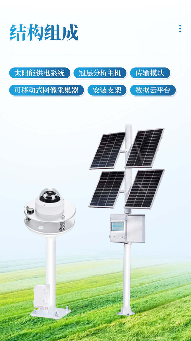 太陽能供電系統(tǒng)、冠層分析主機(jī)、可移動式圖像采集器(含100°鏡頭)、傳輸模塊、安裝支架、數(shù)據(jù)云平臺