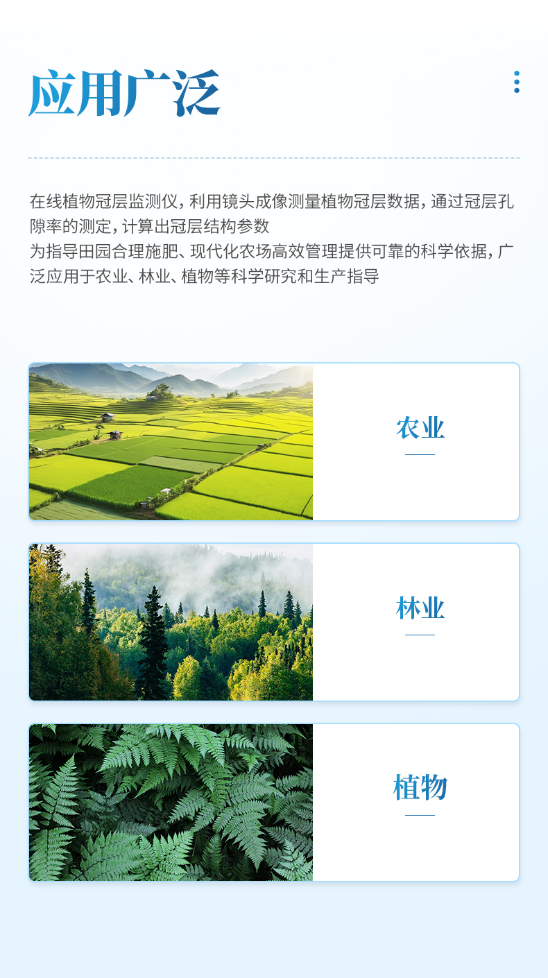 在線植物冠層監(jiān)測儀是一款用于實(shí)時(shí)監(jiān)測植物冠層狀態(tài)的設(shè)備,利用鏡頭成像測量植物冠層數(shù)據(jù),通過冠層孔隙率的測定,計(jì)算出冠層結(jié)構(gòu)參數(shù);這是目前世界上各種冠層儀一致采用的原理,該方法是各類方法中精確、省力、省時(shí)、快捷方便的方法。為指導(dǎo)田園合理施肥、現(xiàn)代化農(nóng)場高效管理提供可靠的科學(xué)依據(jù),廣泛應(yīng)用于農(nóng)業(yè)、林業(yè)、植物等科學(xué)研究和生產(chǎn)指導(dǎo)。