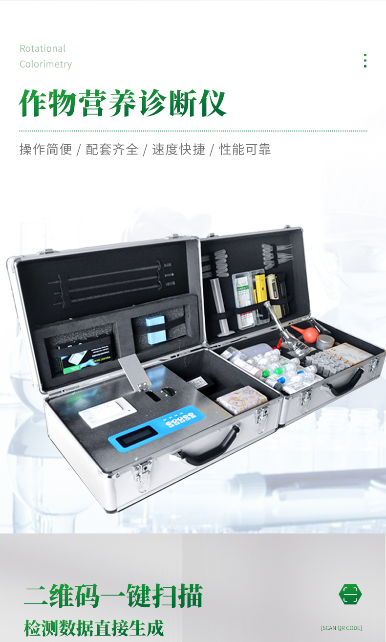 配套齊全:該儀器集藥、器、儀為一體,攜帶方便,相當(dāng)于一個小型實驗室。適于農(nóng)業(yè)服務(wù)部門或農(nóng)資經(jīng)銷商、肥料廠商、莊家醫(yī)院進(jìn)行農(nóng)化服務(wù)。