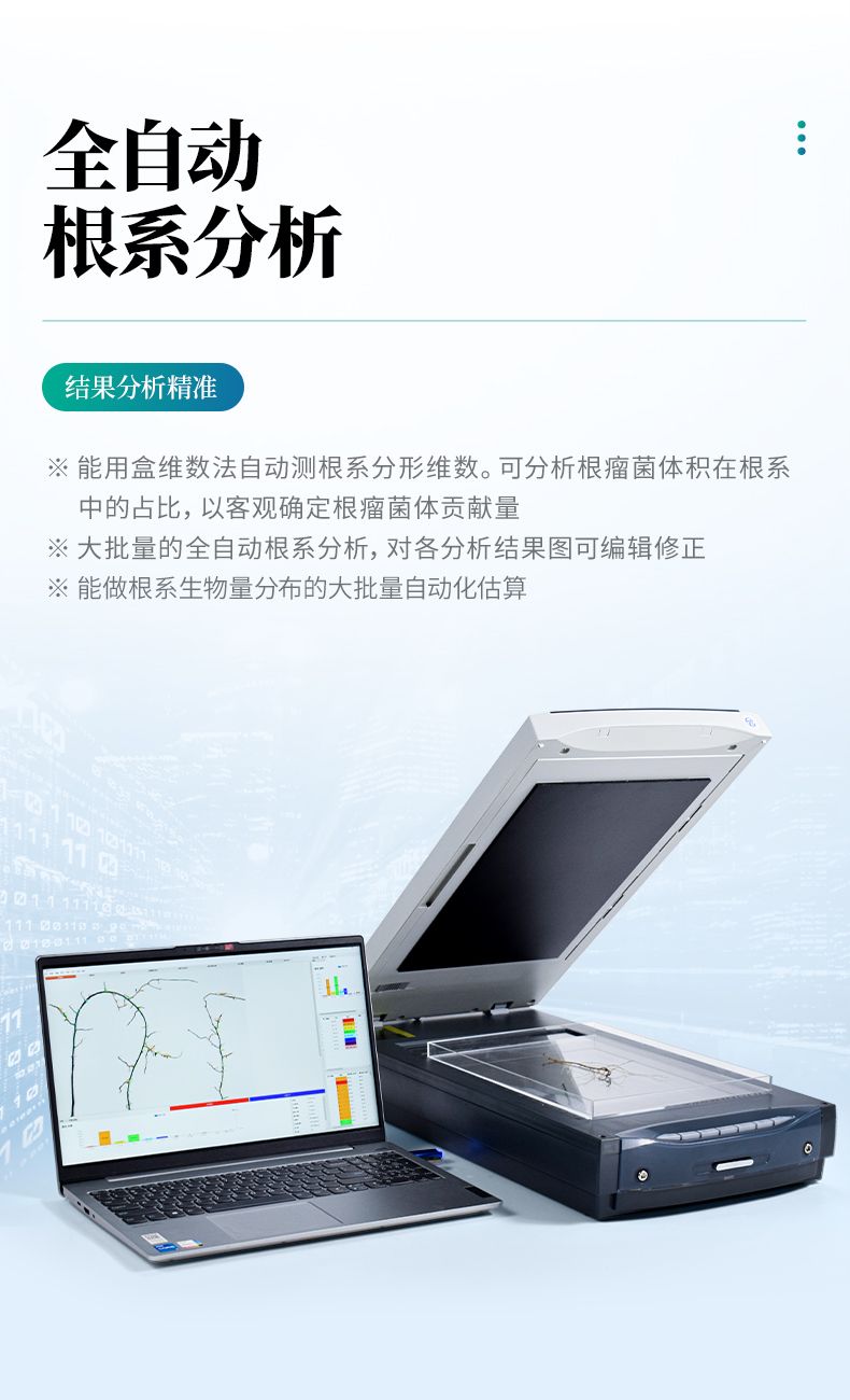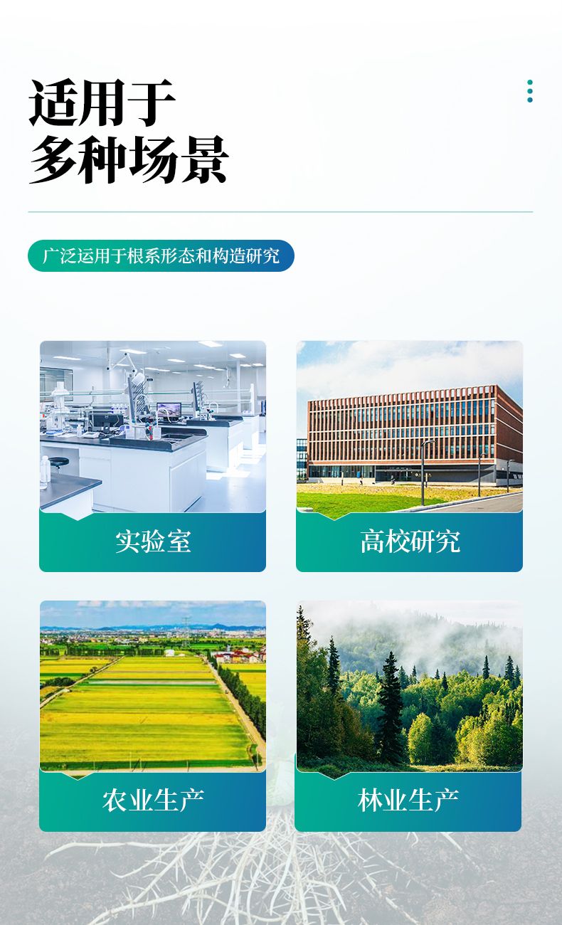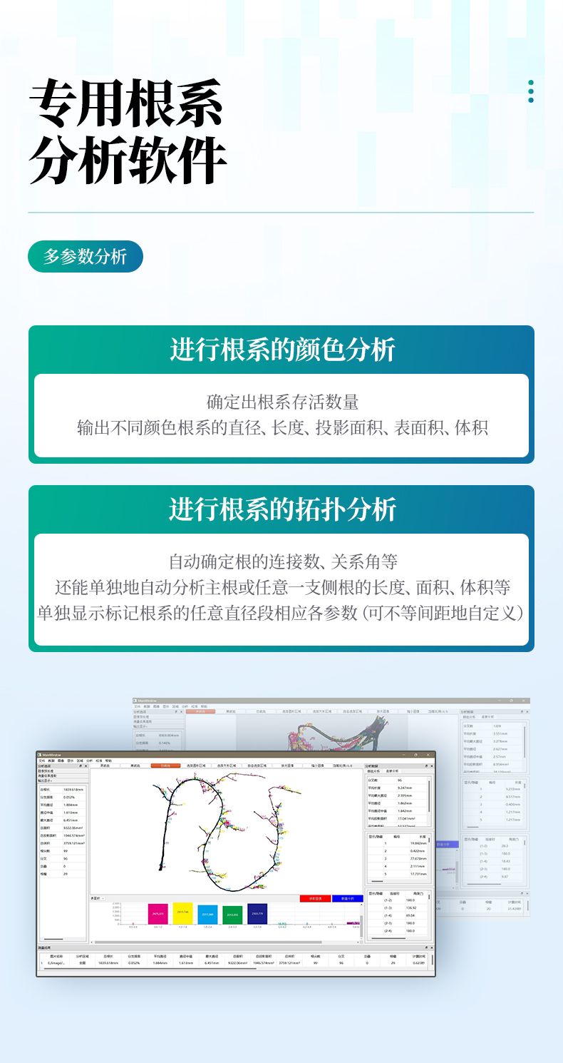 根系分析系統(tǒng)用于洗根后專業(yè)根系分析,還可以用于根盒培養(yǎng)植物的根系表型分析,可以分析根系長度、直徑、面積、體積、根尖記數(shù)等,功能強大,操作簡單,軟件可分析植物根系的形態(tài)分析及根系的整體結構分布等,廣泛運用于根系形態(tài)和構造研究。