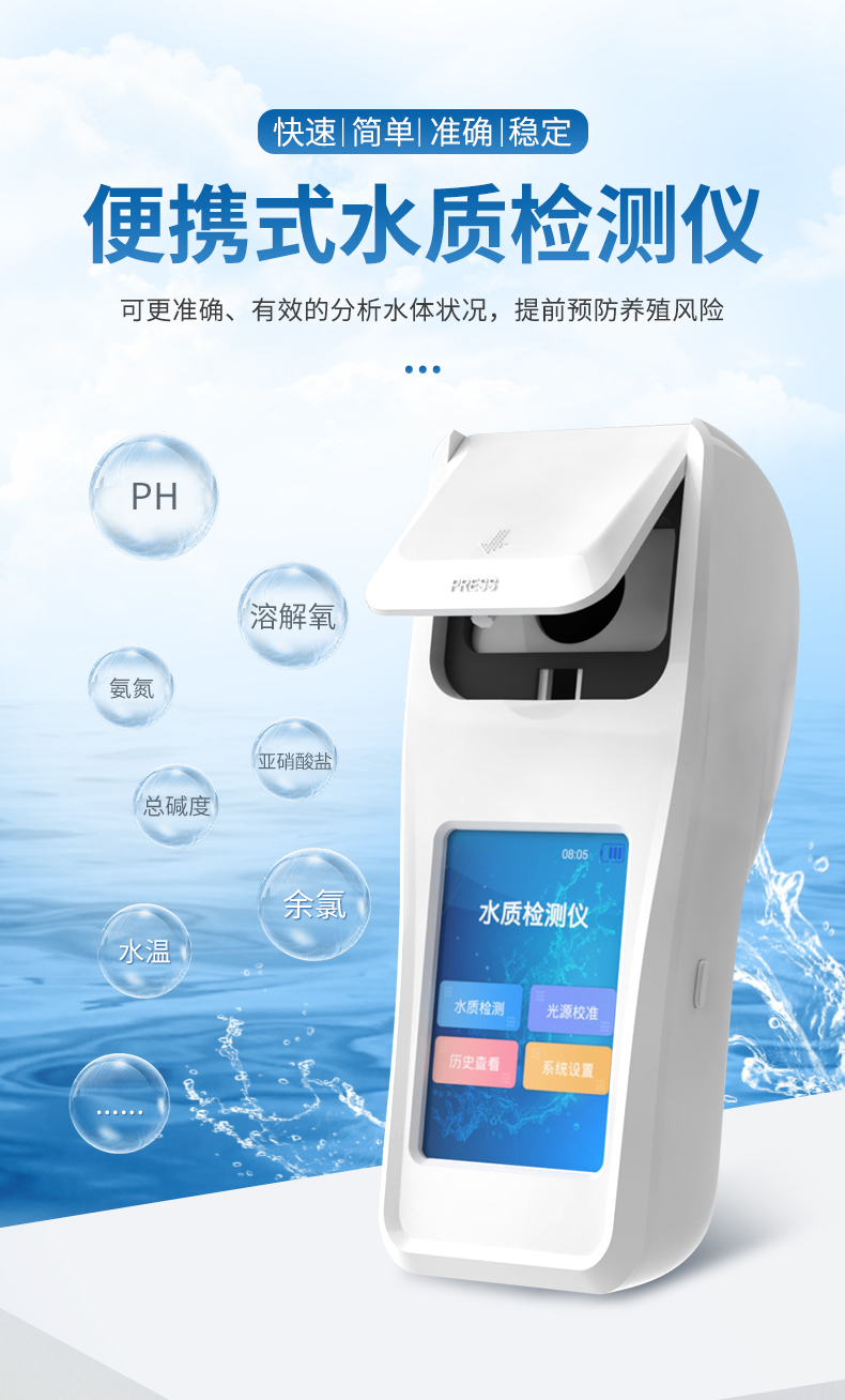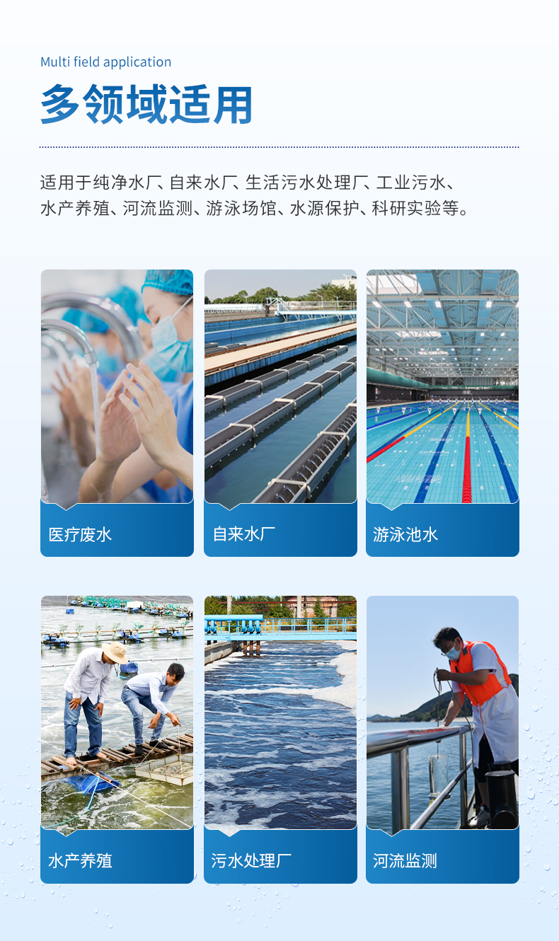 適用于純凈水廠、自來水廠、生活污水處理廠、工業(yè)污水、水產(chǎn)養(yǎng)殖、河流監(jiān)測、游泳場館、水源保護(hù)、生產(chǎn)監(jiān)測、科研實(shí)驗(yàn)等。