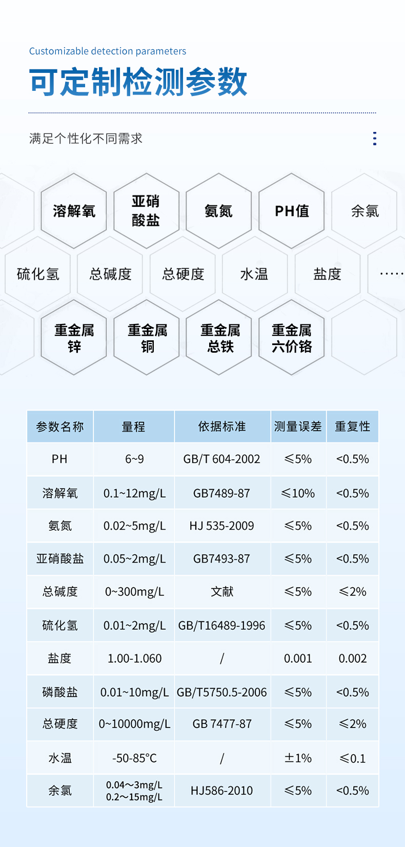 氨氮、亞硝酸鹽、余氯、總氯、二氧化氯、亞氯酸鹽、臭氧、pH、溶解氧、硫化氫、磷酸鹽、硫酸鹽、尿素、氰尿酸、總硬度、總堿度、濁度、懸浮物、水溫、鹽度、氯化物、色度、有效氯等20多種檢測指標(biāo);