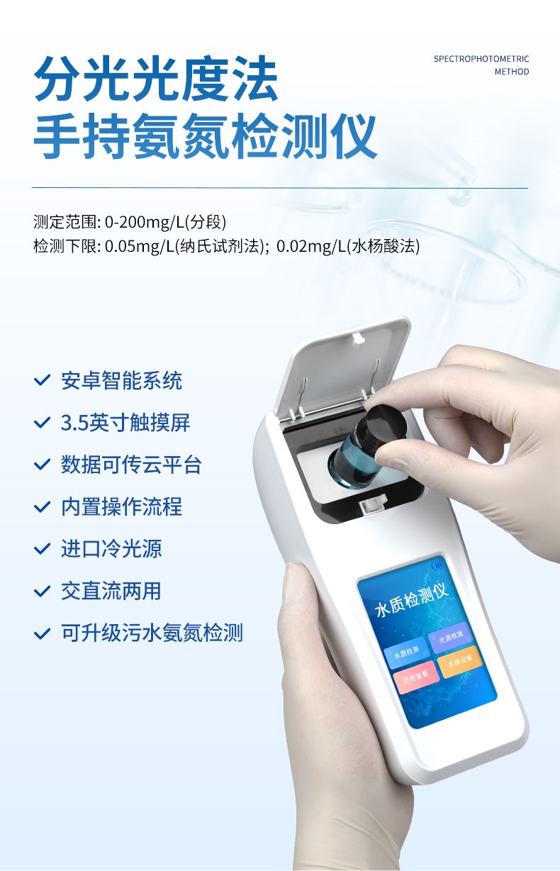 水質(zhì)氨氮檢測儀是一款適用于工業(yè)污水、水產(chǎn)養(yǎng)殖、河流監(jiān)測、游泳場館等領域的檢測儀,配合快速顯色檢測試劑,可“快速、簡單、準確、穩(wěn)定”進行測量,擁有精美的外觀造型,簡單的操作界面,準確的檢測系統(tǒng),幫助用戶獲得精細的數(shù)據(jù),可更準確、有效的分析水體狀況,提前預防,及時避免損失。