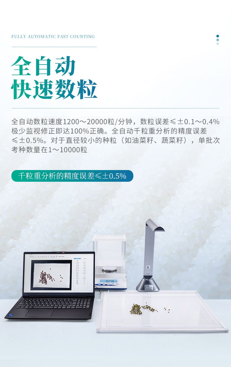 3、★全自動數(shù)粒速度1200~20000粒/分鐘,數(shù)粒誤差≤±0.1~0.4%,極少監(jiān)視修正即達(dá)100%正確。全自動千粒重分析的精度誤差≤±0.5%。對于直徑較小的種粒(如油菜籽、蔬菜籽),單批次考種數(shù)量在1~10000粒。