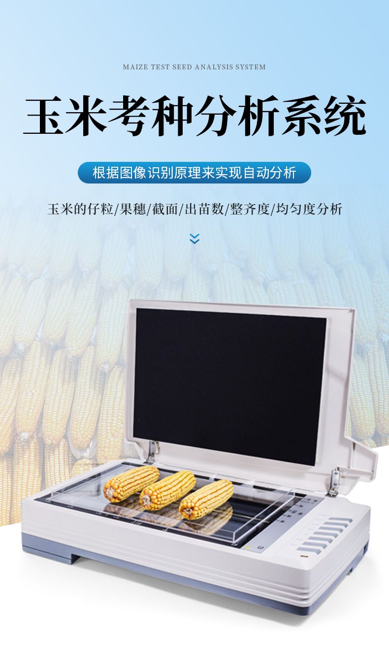 自動玉米考種分析及千粒重系統(tǒng)是根據(jù)圖像識別原理來實現(xiàn)自動分析的。可用于玉米實粒種子的精確考種、對玉米的籽粒、果穗、截面、出苗數(shù)、整齊度、均勻度分析。同時可兼做水稻、小麥、油菜、豆類、花生、芝麻等作物考種分析。