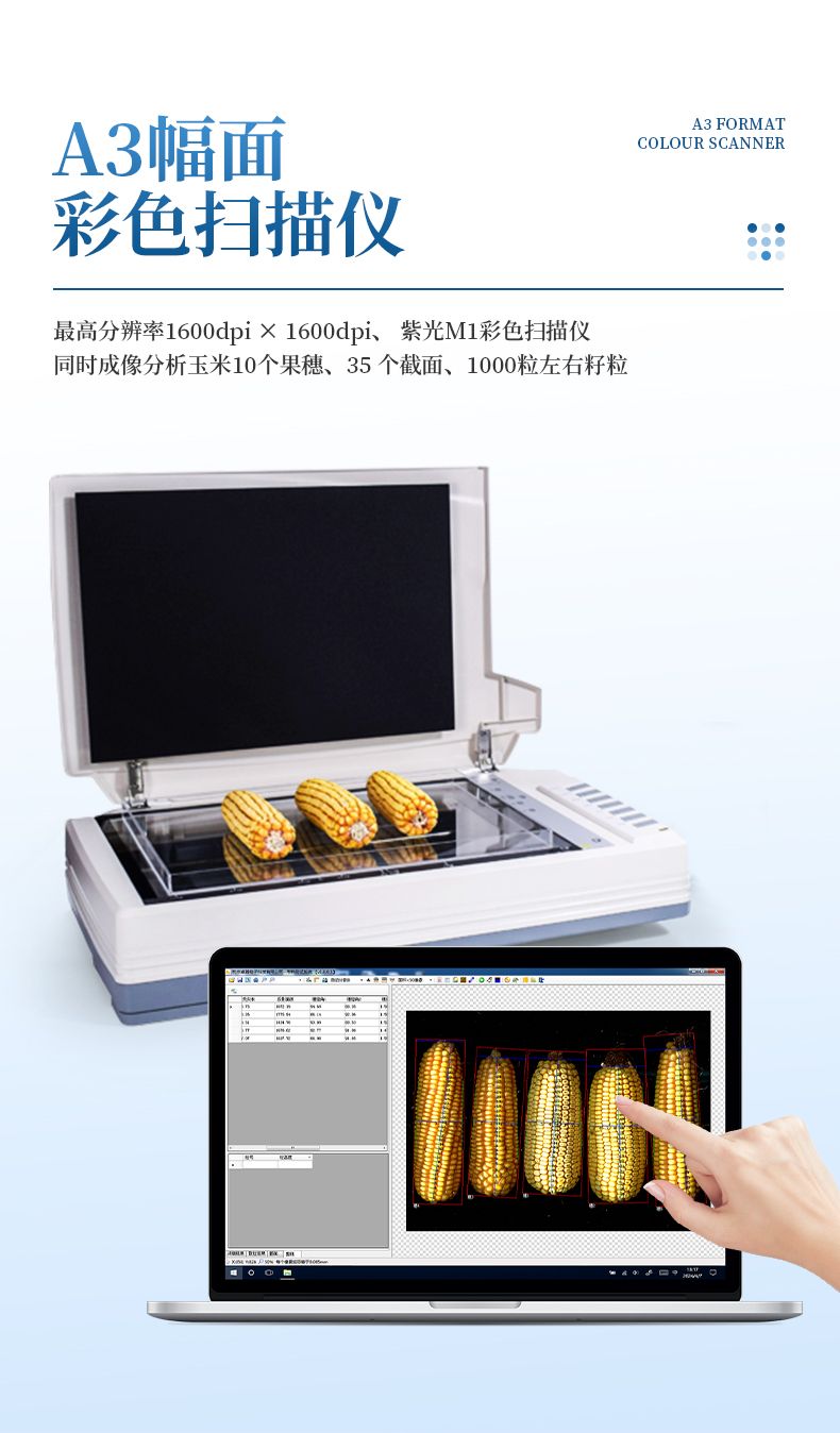6、硬件裝置: A3幅面(最高分辨率1600dpi X 1600dpi) 紫光M1 Plus彩色掃描儀、具有RS232接口的電子天平、A3尺寸透明托盤。