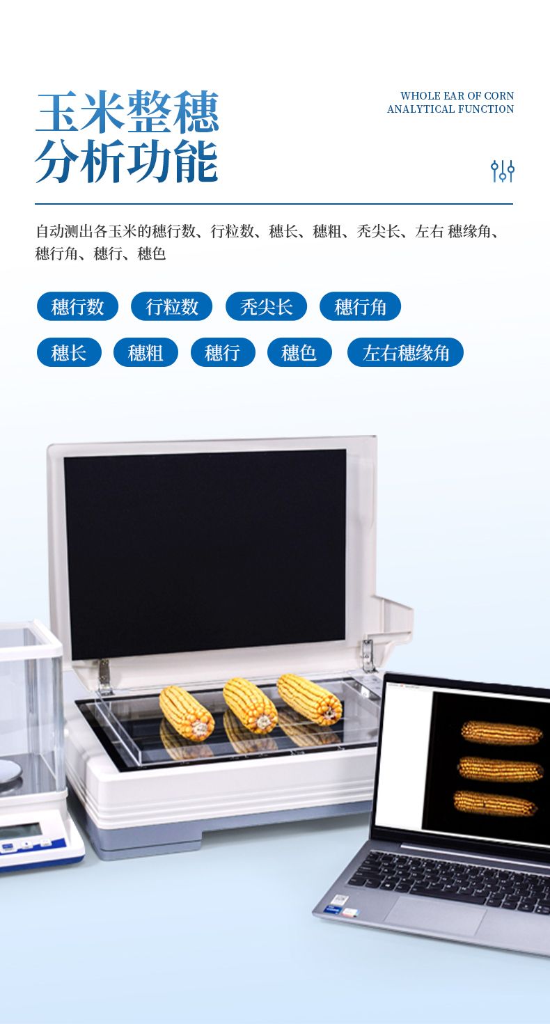 2、玉米整穗分析功能:自動測出各玉米的穗行數(shù)、行粒數(shù)、穗長、穗粗、禿尖長、穗色。