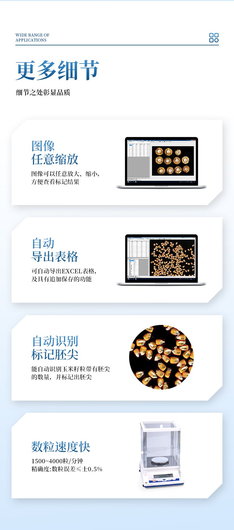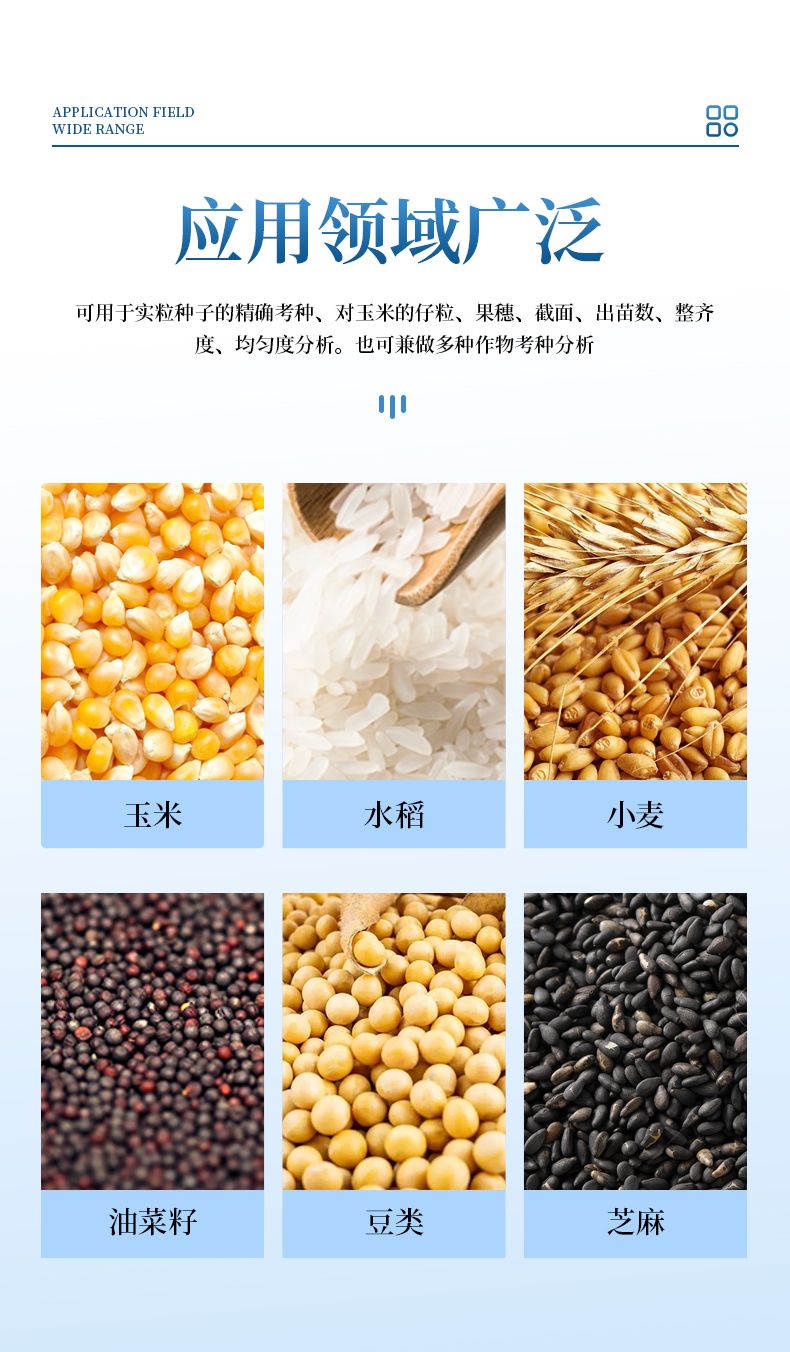 1、適用于玉米,水稻,小麥,大豆、油菜,蔬菜等同粒型種子的粒型指標(biāo)分析。