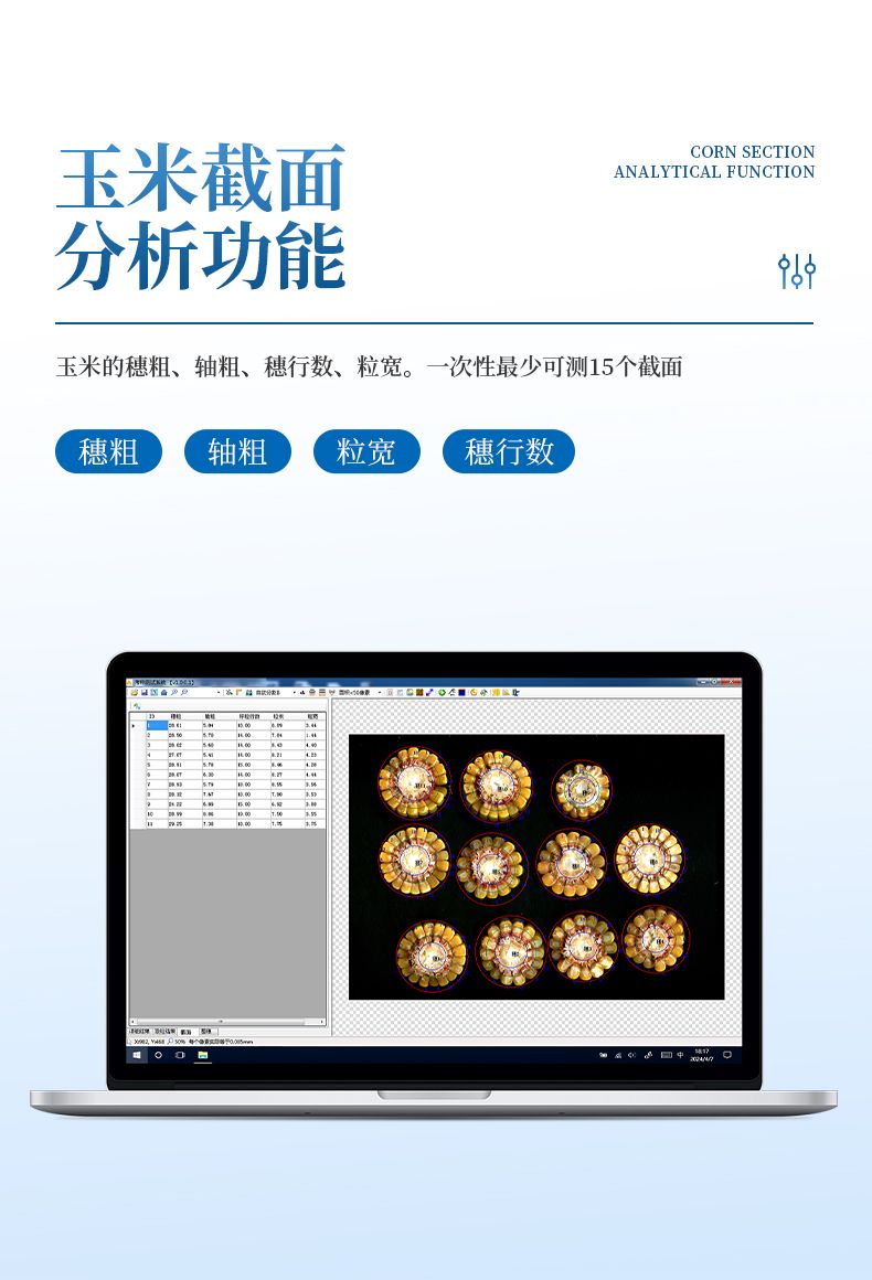 3、玉米截面分析功能:玉米的穗粗、穗直徑、軸粗、軸直徑、穗粒數(shù)、粒長、粒寬、粒周長、粒面積,一次性最少可測35個截面。